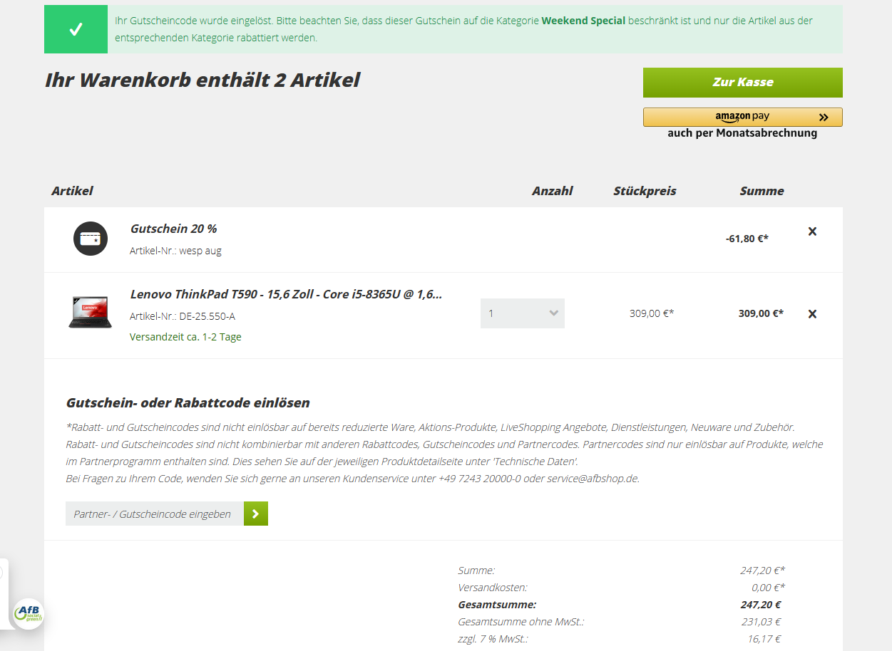 Etliche Lenovo ThinkPads, HP EliteBooks und Dell Latitude Business-Notebooks lassen sich derzeit im Weekend-Sale vom AfB-Shop mit satten 20 % Rabatt günstig ergattern, indem man im Warenkorb den Gutscheincode "WESP2023" einlöst. Dieser gilt bis einschließlich zum 27.08.23 auf alle rabattfähigen Produkte (kombinierbar) im Warenkorb.