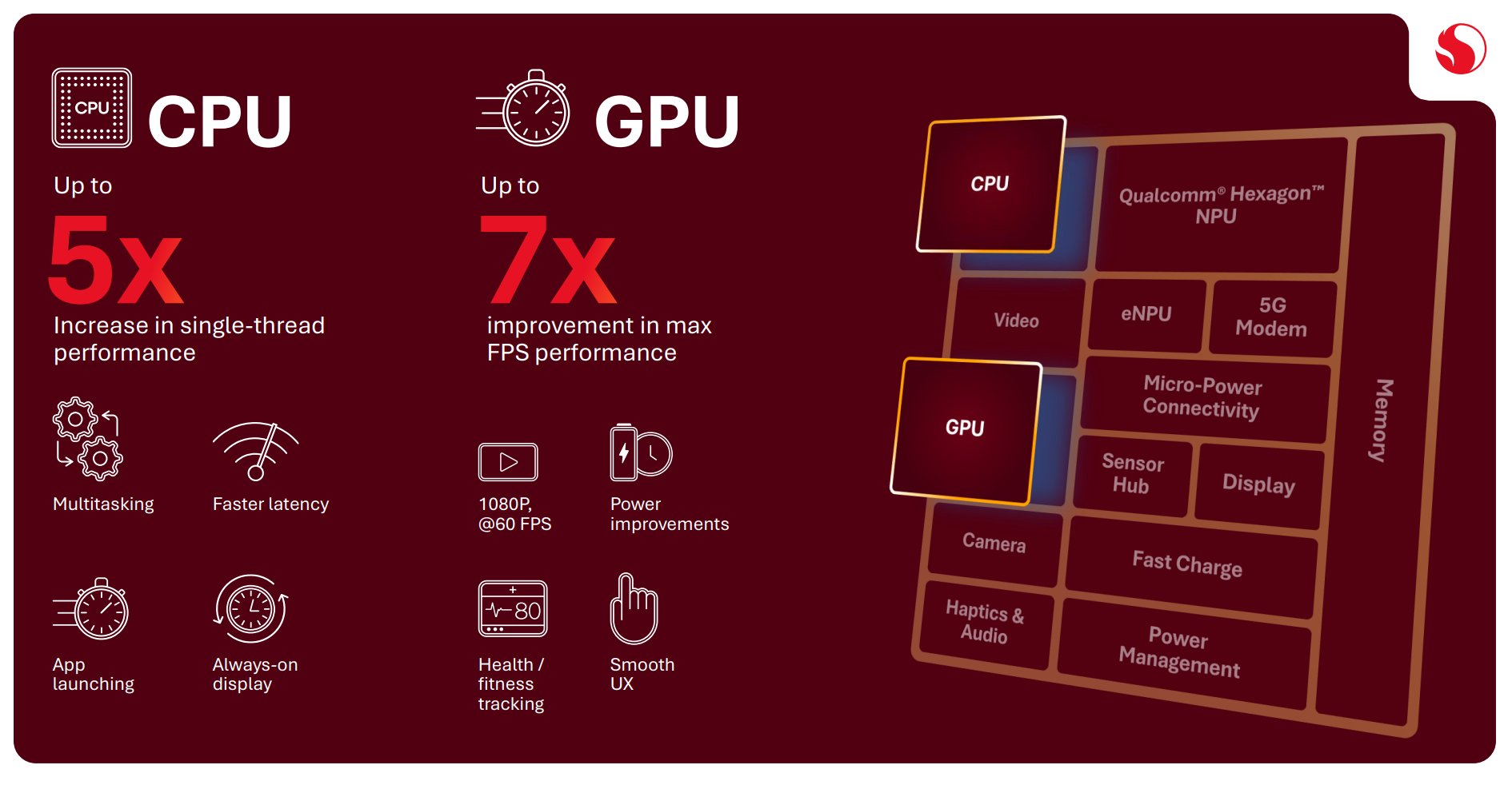 Qualcomms Oryon-Architektur, wie die Bezeichnung "Snapdragon Wear Elite" vielleicht auf den ersten Blick suggerieren könnte, steckt zwar nicht in der nun wieder umbenannten in "Wear" zurück benannten Wearable-Plattform, allerdings gibt nun ein 2,1 Ghz schneller Cortex-A78 Big-Core den Ton an, begleitet von vier kleinen Cortex-A55 Litte-Cores mit 1,95 Ghz Taktfrequenz. Das verspricht schon mal einen gehörigen Performance-Boost, laut Qualcomm um das Fünffache. Auch die Grafikleistung steigt drastisch - laut Hersteller sogar um das 7-fache gegenüber dem Snapdragon W5+ Gen 2.