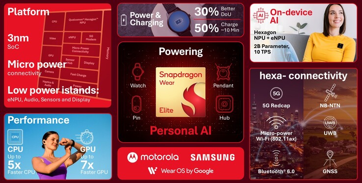 Auch die Effizienz soll sich verbessern, vor allem auch dank 3nm-Fertigung statt 4nm bei den Vorgängern, was zu 30 Prozent längerer DOU (Days of Use) Zeit führen soll, auch schnelleres Aufladen wird unterstützt, konkret 50% in 10 Minuten. Es wäre nicht 2026, wenn nicht auch das Thema Künstliche Intelligenz im Mittelpunkt stünde. Tatsächlich sollen nicht nur klassische Smartwatches künftig vom Snapdragon Wear Elite profitieren sondern zunehmend auch dedizierte AI-Devices wie AI Pins. Und so findet sich auf dem Snapdragon Wear Elite nicht nur erstmals eine Hexagon NPU für On-Device AI sondern auch eine programmierbare Low Power eNPU, die immer im Hintergrund aktiv ist und etwa für die Keyword-Erkennung der KI-Module zuständig ist.
