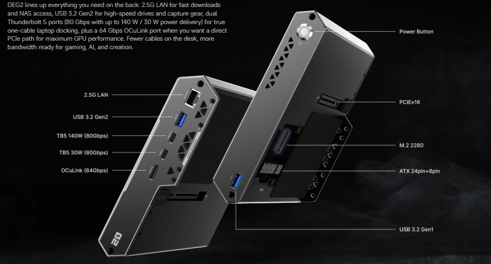 Die DEG2 bringt zusätzlich Anschlüsse mit. Konkret gibt es einmal Gigabit-Ethernet mit einer maximalen Datenübertragungsrate von 2,5 GBit/s, USB 3.2 Gen 2 und auch zweimal Thunderbolt 5 - damit wird auch die Übertragung von elektrischer Energie unterstützt. OCuLink erlaubt die Anbindung an einen kompatiblen Mini-PC oder einen Laptop mit einer Datenübertragungsrate von 64 GBit/s, was insbesondere im Vergleich zu USB 4 eine bessere Performance verspricht.