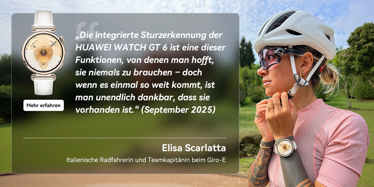 Passiert ein Unfall bzw. Sturz, erkennt die WATCH GT 6 Serie dies automatisch und fordert sofort dazu auf, eine zuvor festgelegte Kontaktperson anzurufen. So kann im Notfall schnell Hilfe organisiert werden, was gerade bei Touren durch die Natur für eine zusätzliche Sicherheitsebene und damit ein gutes Gefühl sorgt. Das weiß auch Elisa Scarlatta besonders zu schätzen, wie sie im September 2025 gesagt hat: