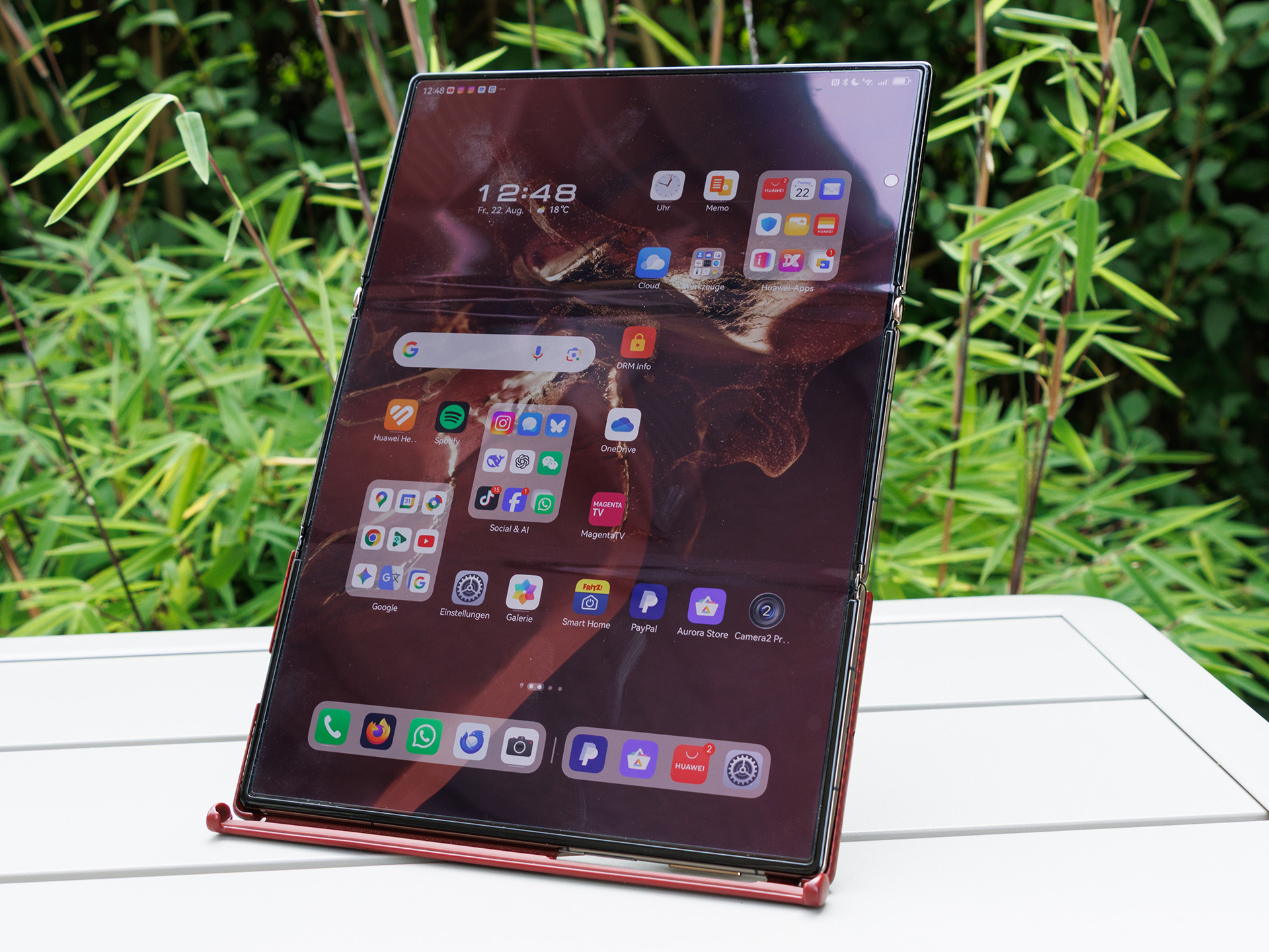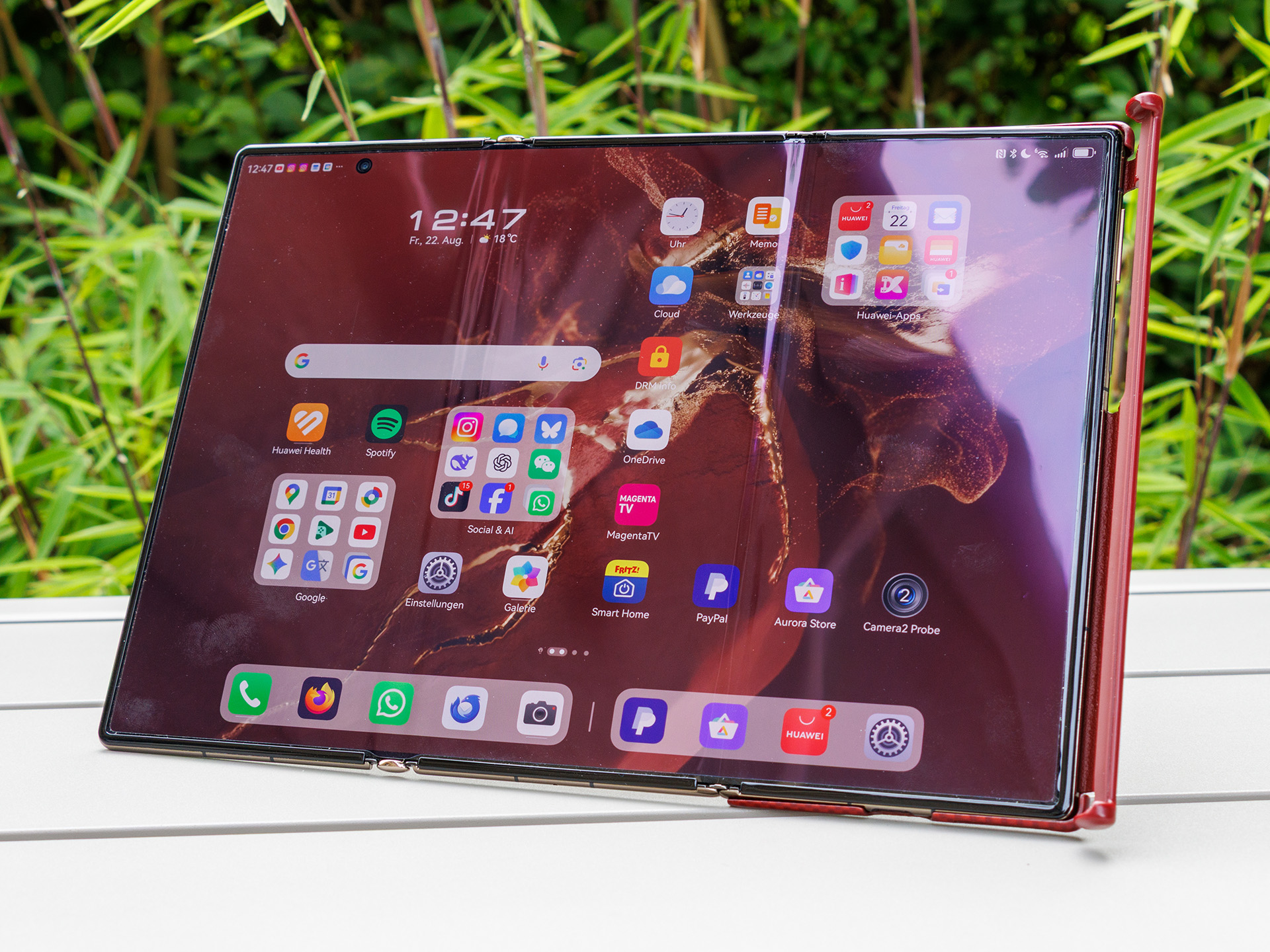 Im geschlossenen Zustand misst der Bildschirm 6,4 Zoll, halb entfaltet stehen 7,9 Zoll zur Verfügung und im komplett geöffneten Modus beeindruckt das Gerät mit einer 10,2 Zoll großen Anzeige. Mit nur 3,6 Millimetern Dicke im aufgeklappten Zustand ist es extrem schlank, gleichzeitig aber mit 306 Gramm verhältnismäßig leicht für ein Foldable dieser Größe. Im Inneren arbeitet der Kirin 9010, unterstützt von 16 GB RAM und bis zu 1 TB Speicher. Das Kamerasystem besteht aus einer 50-Megapixel-Hauptkamera mit variabler Blende, einer 12-Megapixel-Telelinse mit 5,5-fachem optischem Zoom sowie einem 12-Megapixel-Ultraweitwinkel. Für die nötige Ausdauer sorgt ein 5.600-mAh-Akku, der per Kabel mit bis zu 66 Watt und kabellos mit 50 Watt geladen werden kann. Als Betriebssystem kommt EMUI 14.2 auf Basis von Android 12 zum Einsatz, allerdings ohne die Google-Dienste.