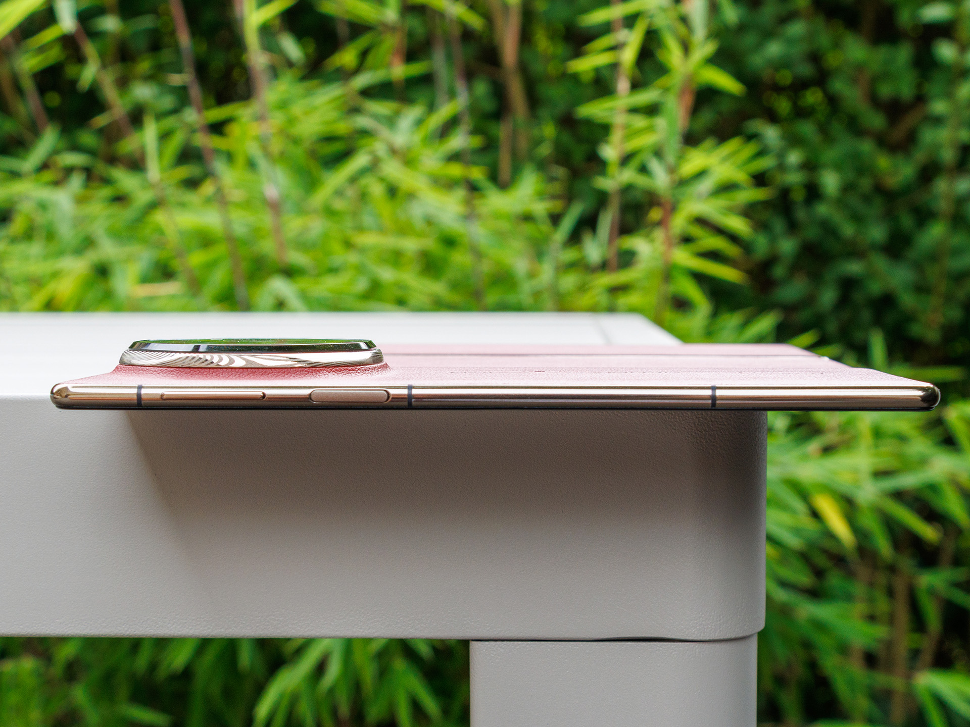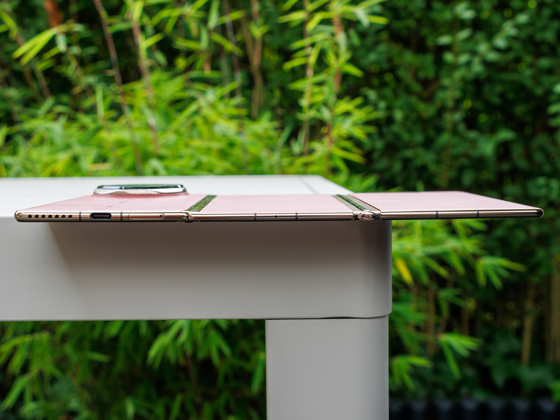 Das Huawei Mate XT ist zusammengefaltet mit 12,8 mm (ohne Kamera) nicht unbedingt ein dünnes Smartphone und trägt in der Hosentasche mächtig auf. Bei Dual-Screen-Nutzung ist es auf der dickeren Seite nominell 7,45 mm und auf der dünner 4,75 mm schlank. Vollständig aufgeklappt sind es mindestens 3,6 mm. Also superdünn. Im Alltag ist es in einer Hand gehalten ziemlich schwer, lässt sich aber auch dann noch gut nutzen. Das echte Highlight ist es jedoch ausgeklappt, denn es ist nicht nur schlank, sondern für ein 10,2-Zoll-Tablet auch leicht (306 g).
