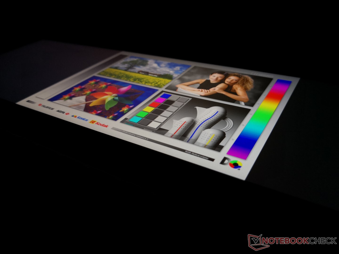 Die Blickwinkel sind ausgezeichnet und besser als bei einem IPS-Panel, wie der beobachtete Kontrast, der auch beim Betrachten von steilen Winkeln unverändert bleibt, eindrucksvoll zeigt. Die für OLED-Panels typischen, regenbogenfarbenen Streifen treten hier bei der Ansicht von extrem steilen Winkeln ebenfalls auf.