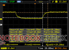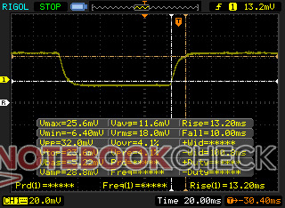 Das Display flackert mit 240.4 Hz (im schlimmsten Fall, eventuell durch Pulsweitenmodulation PWM) bei einer eingestellten Helligkeit von 52 % und darunter. Darüber sollte es zu keinem Flackern kommen. Die Frequenz von 240.4 Hz ist relativ gering und daher sollte es bei sensiblen Personen zu Problemen wie Flackern oder Augenbeschwerden führen. Im Vergleich: 53 % aller getesteten Geräte nutzten kein PWM um die Helligkeit zu reduzieren. Wenn PWM eingesetzt wurde, dann bei einer Frequenz von durchschnittlich 8083 (Minimum 5, Maximum 343500) Hz. | |||