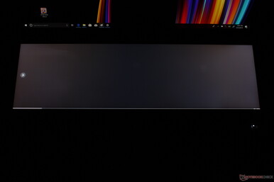 Der matte Zweitbildschirm mit einer Auflösung von 3.840 x 1.110 Pixeln unterscheidet sich trotz identischer DPI und Breite erheblich vom Hauptbildschirm. Da es sich hierbei um ein IPS-Panel handelt, ist es dem OLED-Hauptbildschirm in einigen Eigenschaften wie Reaktionszeiten, Farben, Helligkeit und dem Kontrast unterlegen. Das fällt beim Verschieben von Bildern und Videos zwischen den zwei Bildschirmen auch sofort auf. Während Ersteller digitaler Inhalte, die auf eine 1:1-Dual-Bildschirmkonfiguration hoffen, enttäuscht werden, wirkt sich dies auf Gamer und Multimedia-Nutzer weniger stark aus.