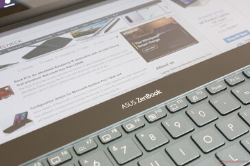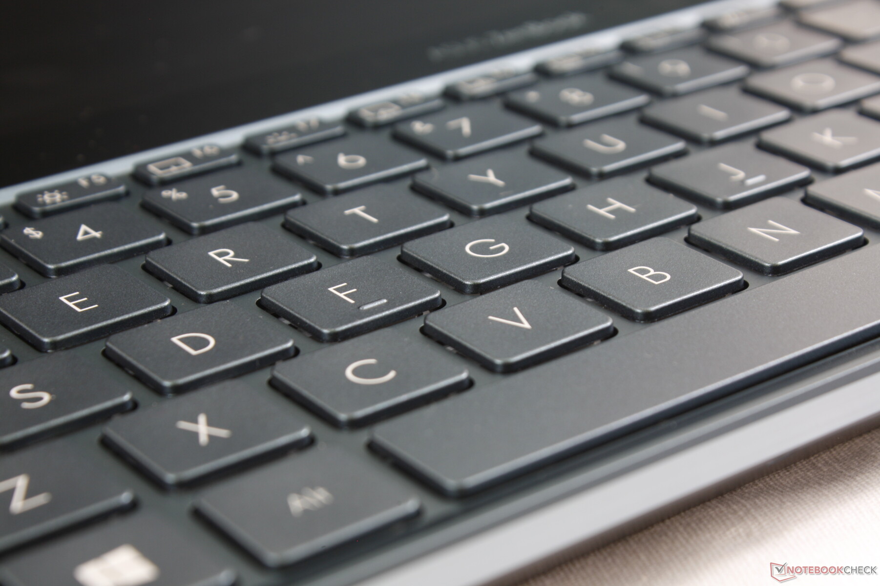 Asus hat sich seit den alten Zephyrus-GX501-Tagen beim Entwerfen von Fronttastaturen stets verbessert. Die QWERTY-Standardtasten des UX581 besitzen einen größeren Tastenhub und ein deutlicheres Feedback als beim GX501 und wirken dadurch eher wie bei einer klassischen, vertrauten Ultrabook-Tastatur. Das UX581 leidet jedoch unter einer entscheidenden Schwäche, die das Tippen erschwert. Die Vorderkante des Laptops ist etwas höher als die Tastatur, wodurch man beim Versuch, die Leertaste zu drücken, versehentlich an der Kante des Laptops hängen bleiben kann. Unter diesem Problem leiden andere Laptops wie das GX501 oder HP Omen X 2S 15 nicht.