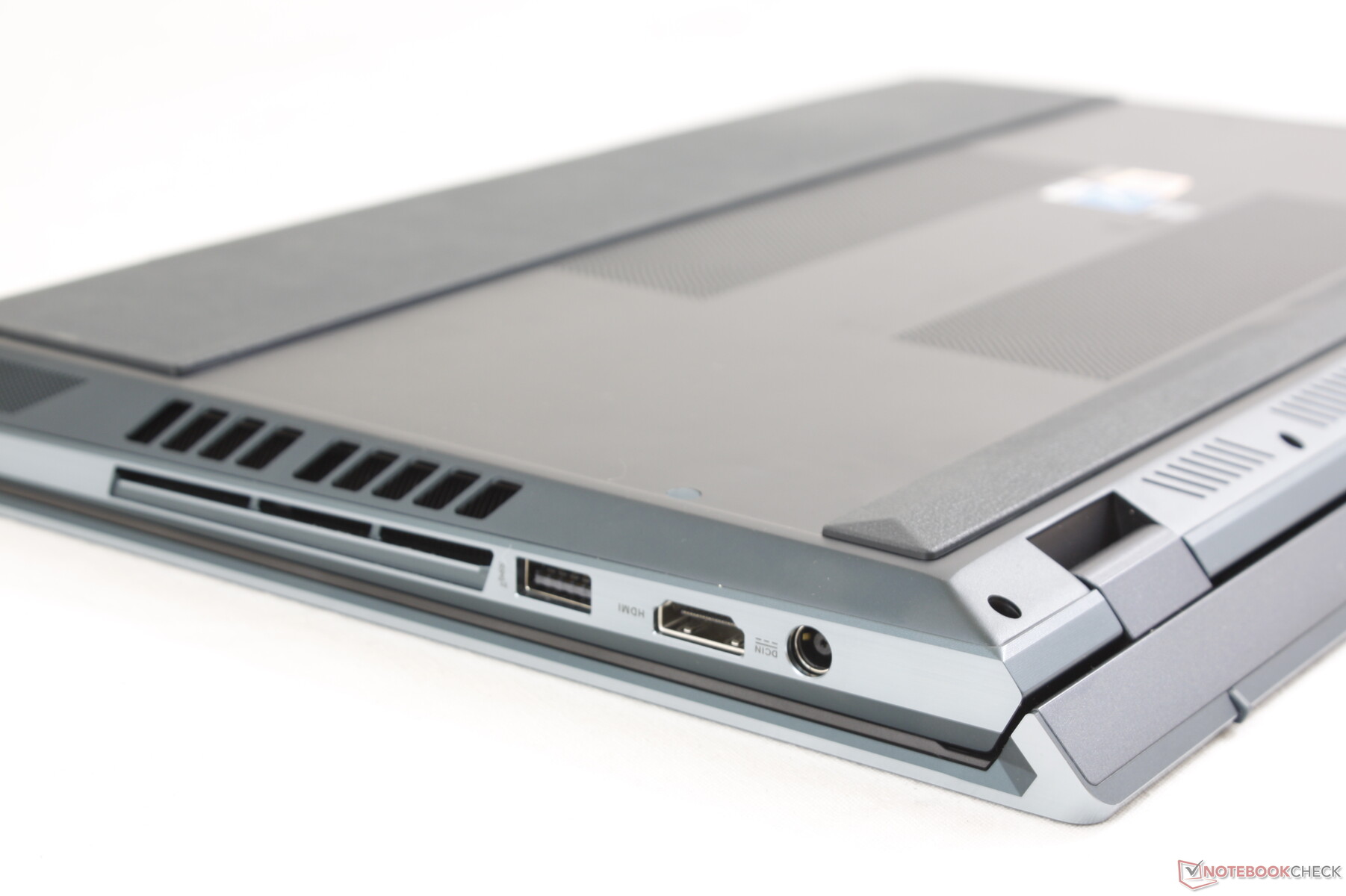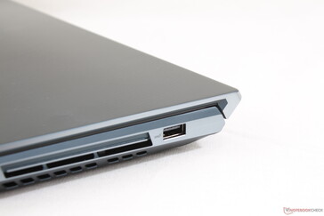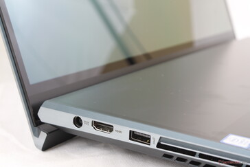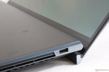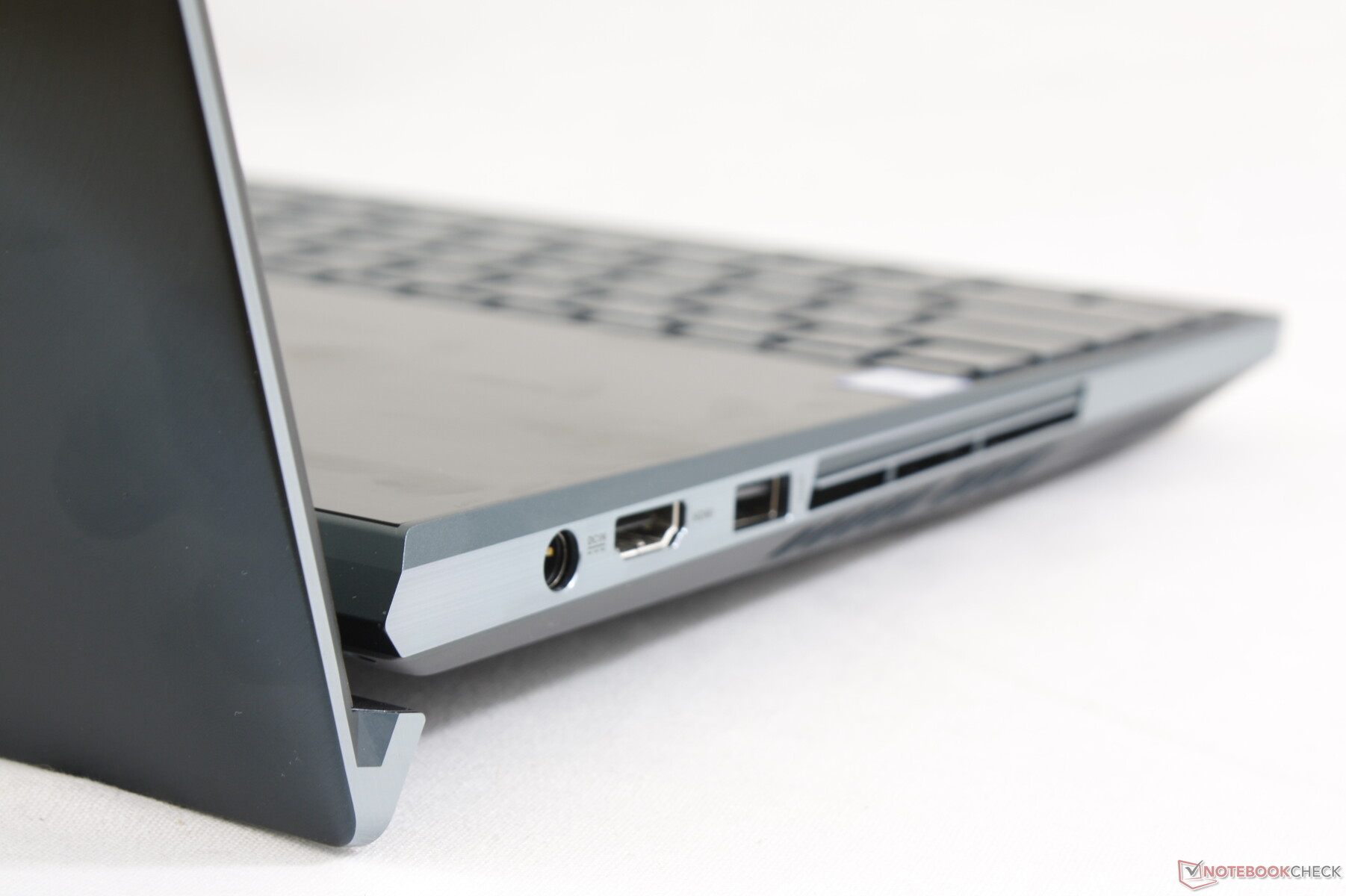 Die Anschlussausstattung fällt etwas mager aus. Trotz dem dickeren und schwereren Gehäuse verfügt das UX581 über weniger Anschlüsse als das UX580 aus dem Vorjahr. Asus verzichtet hier auf den MicroSD-Kartenleser und ersetzt einen USB-C-Anschluss durch einen zusätzlichen USB-A-Anschluss. Davon abgesehen ist das Anschlusslayout gut, und alle Anschlüsse wurden gleichmäßig und gut zugänglich auf die Seiten verteilt.