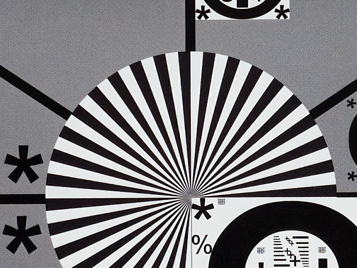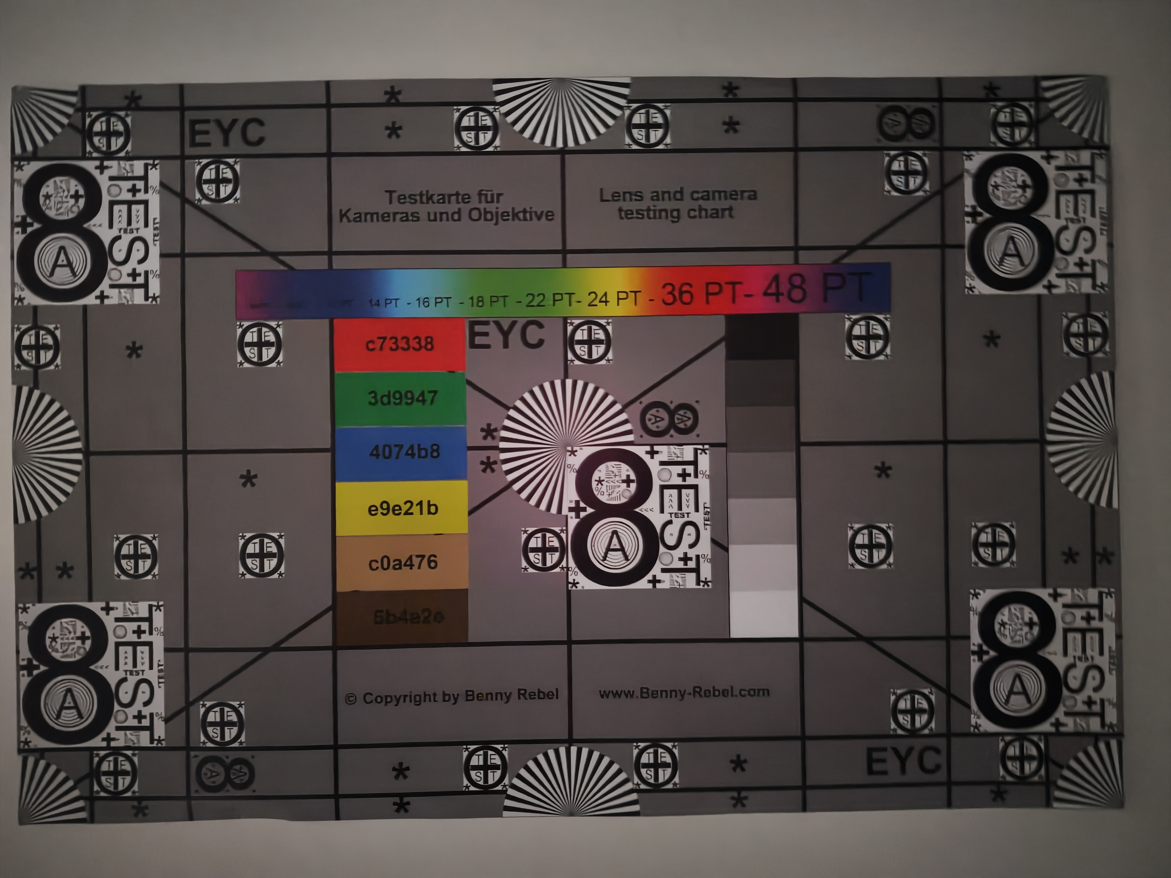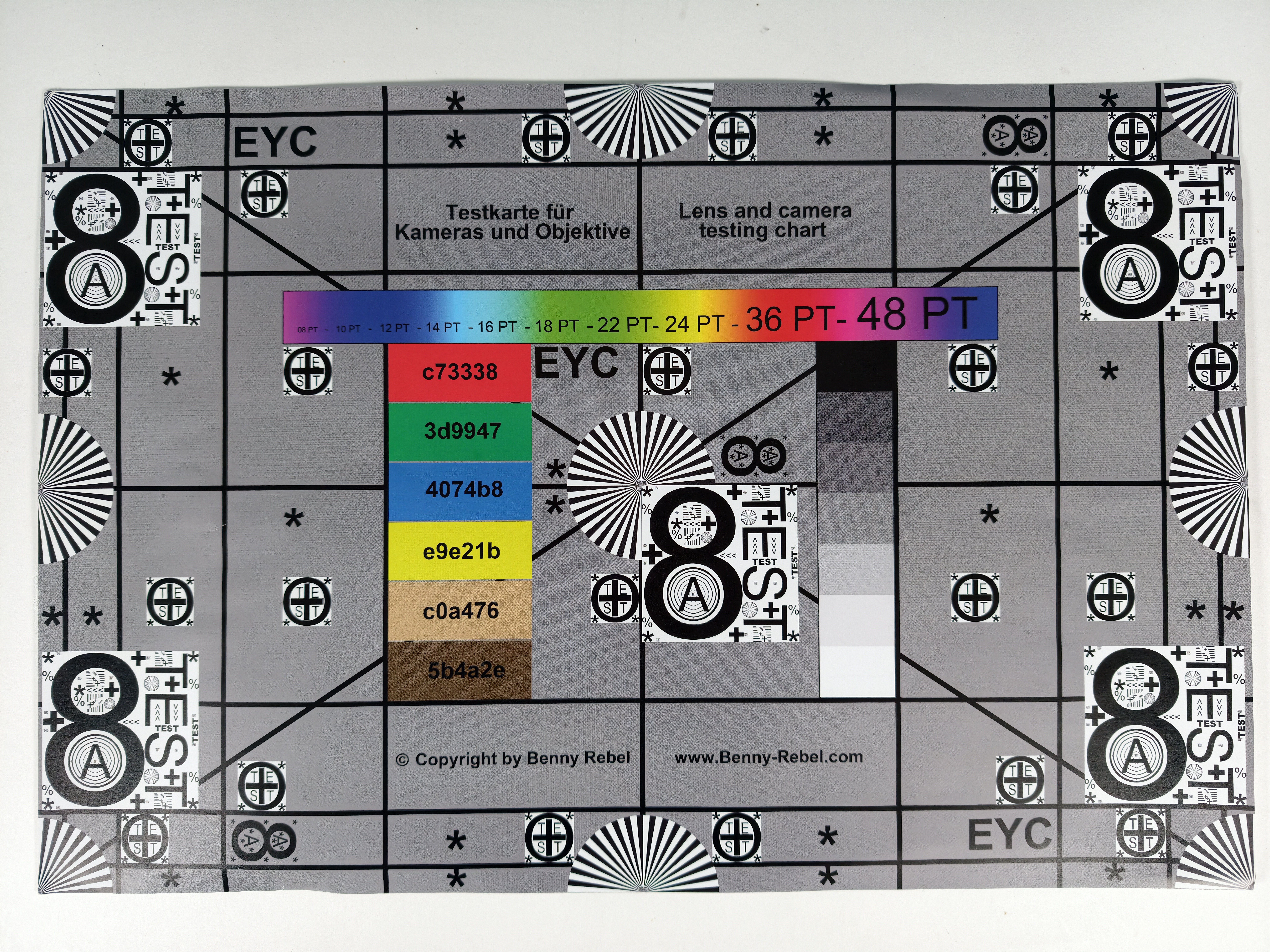 Auch das Testchart wird sehr gut eingefangen und bildet selbst feine Details noch gut erkennbar ab. In den Randbereichen kommen zarte Unschärfen sowie Aberrationen an den Rändern hinzu, beides ist aber nur dezent vorhanden.