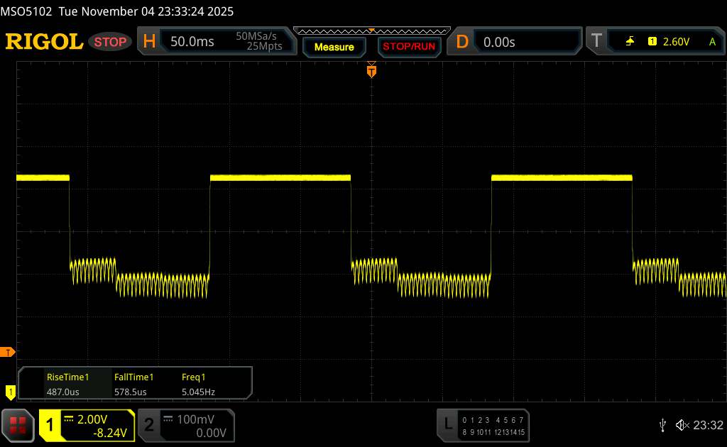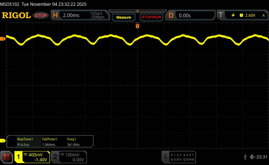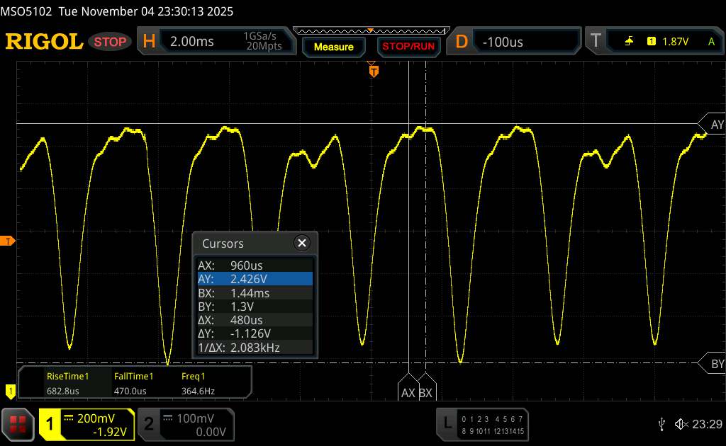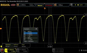 Mit dem Oszilloskop messen wir ein Grundflackern mit rund 360 Hz. Zusätzlich nutzt Vivo ein hochfrequentes PWM-Dimming, welches bei minimaler Displayhelligkeit 2.083 Hz erreicht. Dies und der flache Amplitudenverlauf sollten bei den meisten Menschen keine Beschwerden auslösen, vollständig ausschließen lässt sich dies bei sensitiven Personen aber dennoch nicht.