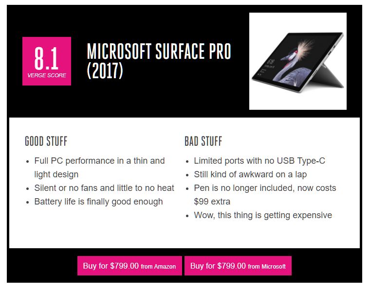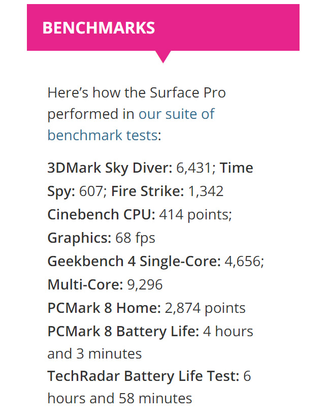 Beginnen wir mit dem Surface Pro. The Verge lobte das neue Surface Pro für "full PC performance in a thin and light design". TechRadar verlieh dem Surface Pro die Auszeichnung "Recommended" mit 4,5 von 5 Sternen und lieferte sogar eine gute Anzahl an Benchmark-Ergebnissen, darunter Cinebench. Digital Trends bewertete das Surface Pro mit 9,0 von 10 und nannte es "excellent notebook performance in a tablet format". Keine dieser Stellen erwähnt einen Leistungsverlust, weil sie nicht darauf getestet haben.