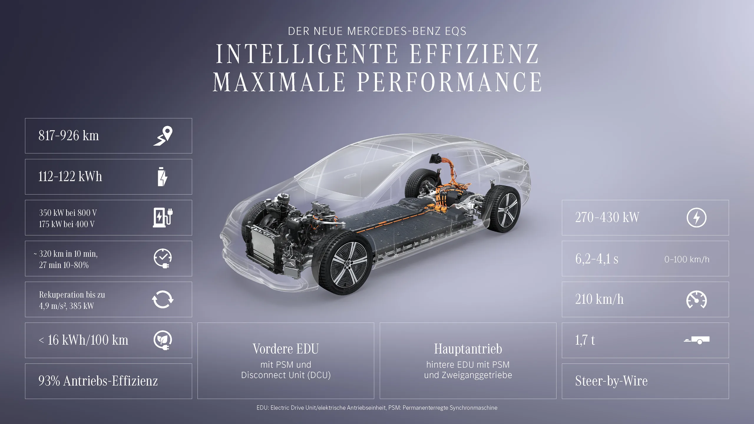 Der EQS erhält ein 800-Volt-System, neue intern entwickelte Antriebseinheiten, ein Zweigang-Getriebe an der Hinterachse, größere Batterien sowie das Betriebssystem MB.OS. Beim EQS 450+ verspricht Mercedes nun bis zu 926 Kilometer WLTP-Reichweite. Laut Hersteller soll man damit von München bis nach Paris oder von Zürich bis nach Hamburg kommen – ohne Ladestopp. Dass diese Werte auch in der Praxis erreicht werden, ist aber eher unwahrscheinlich.
