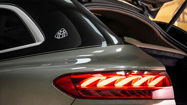 Markentypisch unterstreicht das Maybach-Emblem an verschiedenen Stellen als Designelement die Exklusivität des Elektro-Luxusliners: Edelstahl-Pedalanlage, Kissen der Kopfstützen, vordere Sitzlehnen und als Projektion den Fußraum im Fond. In Verbindung mit dem First-Class Fond findet es sich auch auf dem Holzzierteil zwischen den Fondsitzen. Bei geöffnetem Kofferraum ist es zudem auf der Innenverkleidung der Heckklappe zu sehen. Der Marken-Schriftzug differenziert das Lenkrad und begrüßt auf den Edelstahl-Einstiegsleisten in beleuchteter Form alle Fahrgäste.