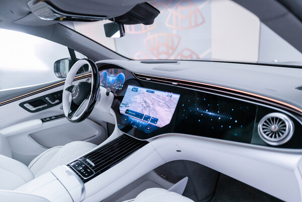 Die Gestaltung des EQS 680 im Innenraums umfasst den MBUX-Hyperscreen mit Maybach spezifischen Start-up-Animationen auf allen drei Displays mit visuellem Gesamteindruck in edlem Tiefblau. Zu den zahlreichen exklusiven Merkmalen zählt die animierte Anzeige des Kombi-Instruments im Maybach-Modus. Die Einfassung der Rundinstrumente ist im markentypischen Roségold gehalten. Als alternative Anzeigeform zu den Tuben ist der sportliche "Pure EV"-Stil als räumlich dargestellte Leistungsspange wählbar (Fahren, Beschleunigen, Laden).