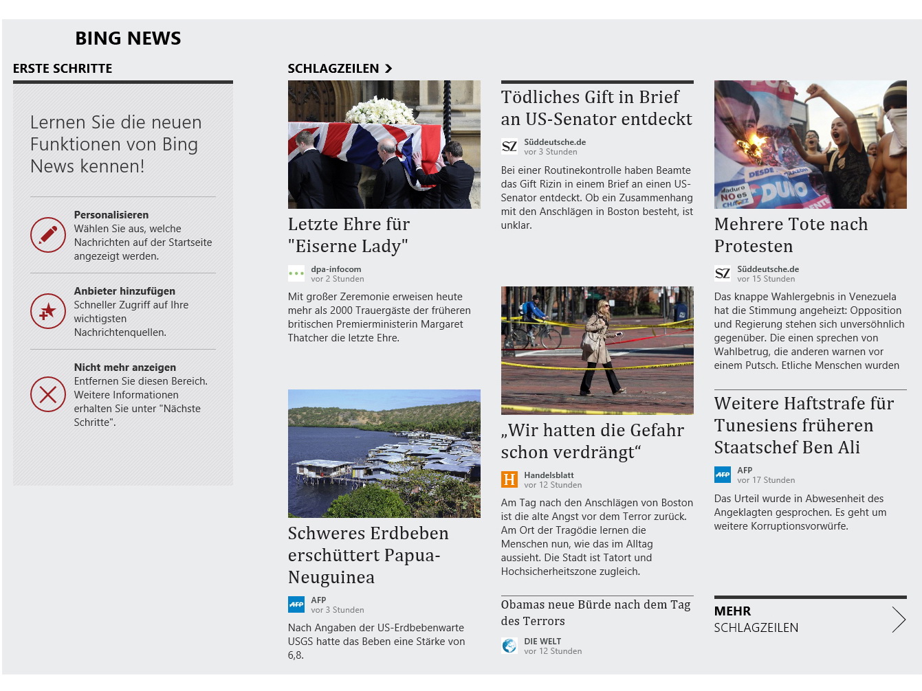 - News: Mit der Bing News-App erhalten Nutzer einfachen Zugriff auf die bekanntesten Newsanbieter Deutschlands, wie beispielsweise das Handelsblatt, die Frankfurter Allgemeine Zeitung, die Süddeutsche Zeitung bis hin zur Tagesschau. Durch eine neue Filterfunktion kann nach Kategorien, speziellen Themen und Quellen gesucht werden, um noch schneller an die gewünschten Informationen zu kommen. RSS-Feeds können unkompliziert eingebunden und auch offline gelesen werden.