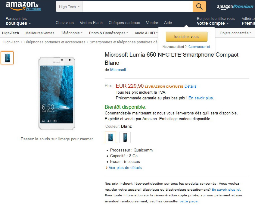 Das Lumia 650 von Microsoft kommt mit einem Metallrahmen daher. Das geht aus einer Produktseite für das Windows-Phone hervor, die für kurze Zeit bereits bei Amazon Frankreich online abrufbar war. Inzwischen hat Amazon.fr allerdings das Lumia 650 mit der ASIN B01ARBWAKY wieder offline genommen.