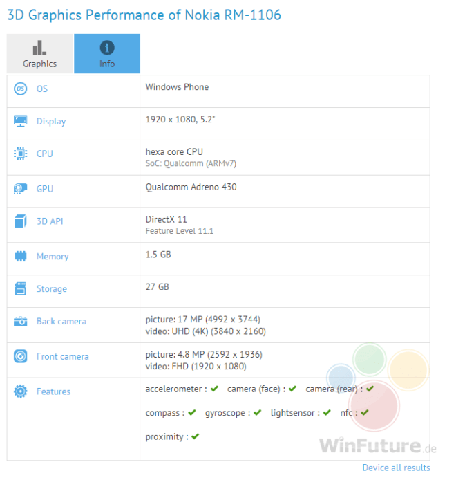 Die GFX-Benchmarkwebsite enthüllt ein neues Windows-Smartphone mit der Modellnummer RM-1106. Laut dem Eintrag hat es ein 5,2 Zoll großes Display mit einer Auflösung von 1.920 x 1.080 Pixeln. Ferner ist der 64-Bit-SoC Snapdragon 808 verbaut. Der aufgeführte Grafikchip Adreno 430 passt allerdings nicht zum Chip. Wahrscheinlich ist der Eintrag fehlerhaft. Die Adreno 418 gehört zum Snapdragon 808.