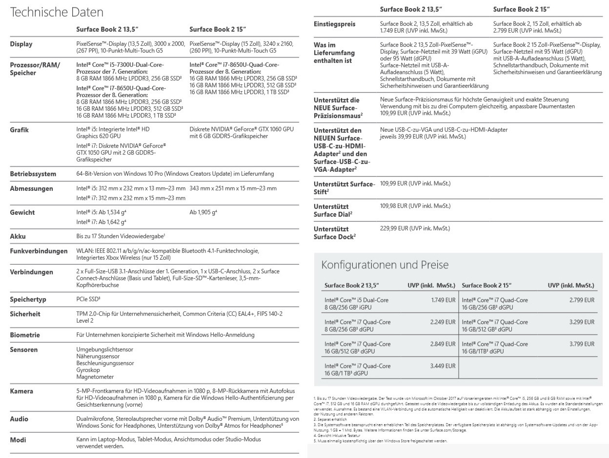 Ende Januar hatte Microsoft zunächst die Preise für die Modelle des Surface Book 2 Convertibles mit 15 Zoll, Intel Core i7-8650U Quadcore-Prozessor (8 Threads) der 8. Generation (Kaby Lake R) sowie dedizierter und spieletauglicher Grafikkarte Nvidia GeForce GTX 1060 mit 6 GB GDDR5 verraten.