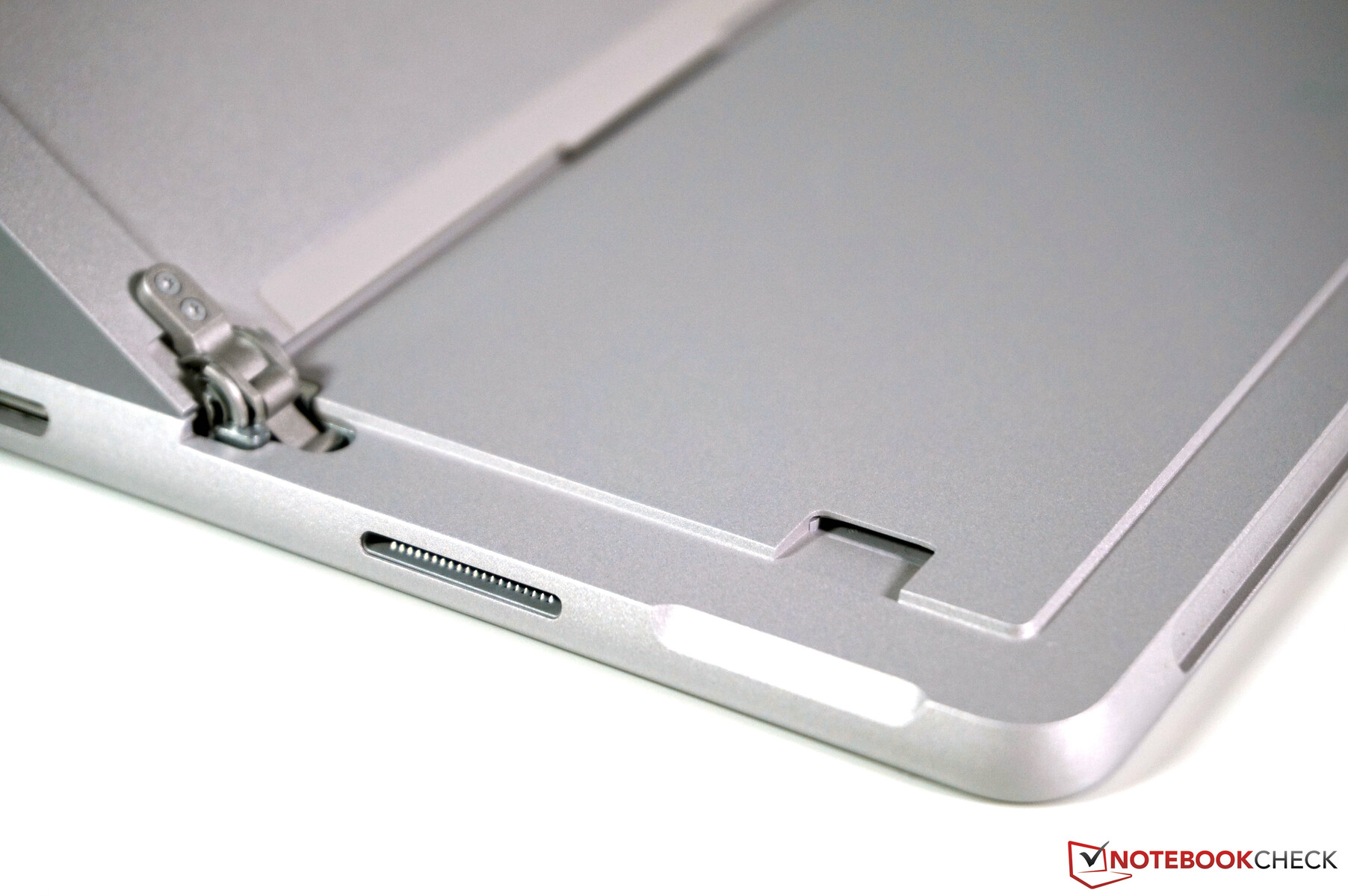 Microsoft hat das Gehäuse des Surface Go 2 nicht verändert, durch das größere Display und die schmaleren Bildschirmränder wirkt das Gerät aber moderner. Die Qualität des Magnesiumgehäuses ist weiterhin sehr gut und den vergleichsweise geringen Kaufpreis im Vergleich zum Surface Pro 7 merkt man dem Gerät nicht an. Die einzige Schwachstelle ist der eingebaute Ständer. Er erfüllt zwar seinen Zweck, besteht aber nur aus relativ dünnem Kunststoff und im Scharnier selbst gibt es auch ein leichtes Spiel. Die Funktionalität ist dadurch aber nicht eingeschränkt.
