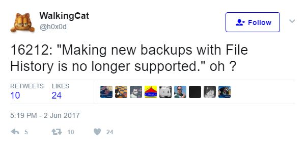 Eine Analyse der neuesten Windows Build 16212 führt Überraschendes (siehe Tweet unten) zu Tage. Microsoft scheint im Begriff zu sein, ein Feature abzulösen, das mit Windows 8 eingeführt wurde, den Dateiversionsverlauf, auf Englisch besser bekannt als File History. In Windows 10 Creators Update aktuell noch als Backup-Feature in den Einstellungen aktivierbar, ist damit die Wiederherstellung von älteren Dateien über Snapshot-Kopien auf externen Laufwerken möglich, eine Art Time-Machine-Backup für Windows-Rechner.