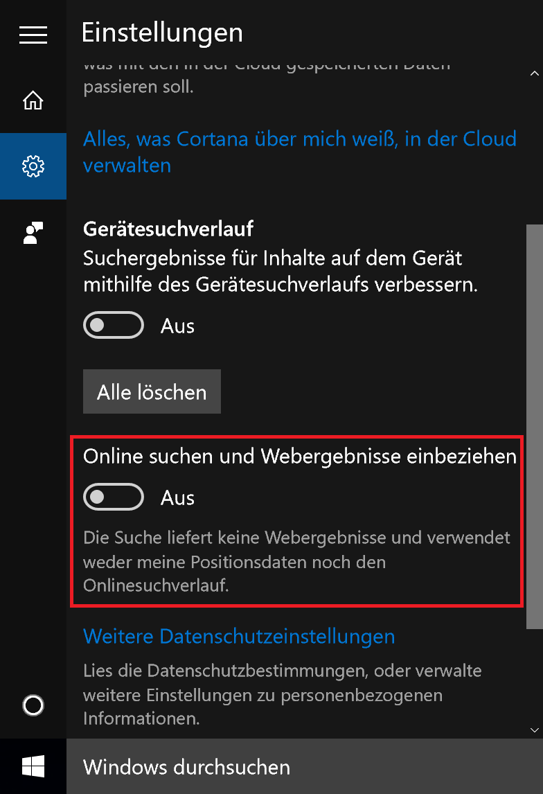 eingetragen werden. Damit wird die Websuche für alle Benutzer des PC's ausgeschaltet. Nutzer der Pro- oder Enterprise-Edition können wahlweise auch Gruppenrichtlinien bemühen: Die Richtlinie "Cortana zulassen" ist unter