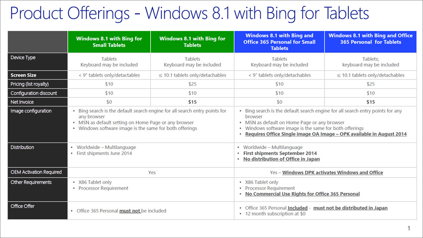 Im Kern geht aus diesem Dokument hervor, dass Microsoft für sein Betriebssystem Windows 8.1 mit Bing auf Tablet-Computern mit x86-Prozessoren - entgegen der weit verbreiteten Meinung, das OS sei kostenlos - mindestens 10 US-Dollar verlangt. Erst wenn der Lizenznehmer bestimmte und von Microsoft festgelegte Konfigurationen verwendet, reduziert sich der Preis bei Tablets mit Displays kleiner 9 Zoll auf 0 US-Dollar.
