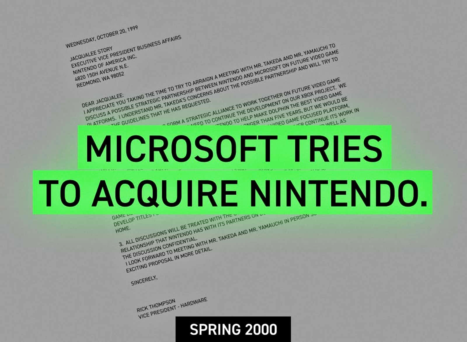 Im Xbox-Museum ist nun erstmals ein Brief zu sehen, der bestätigt, dass Microsoft den Spiele-Giganten aus Japan tatsächlich übernehmen wollte. Der Brief, der am 20. Oktober 1999 von Microsofts Rick Thompson an Nintendo of America verschickt wurde, ist aufgrund der gigantischen grünen Textbox über dem Foto leider nur teilweise lesbar.