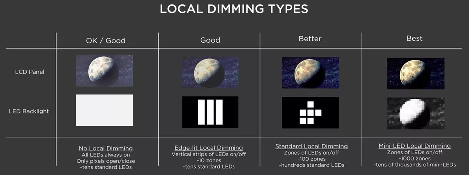 Wie wir gerade bereits erklärt haben, bieten Mini-LEDs ein deutlich besseres Local Dimming gegenüber konventionellen LEDs. Mini-LEDs können im Gegensatz zu OLEDs zwar nicht Pixel-für-Pixel deaktiviert werden, dennoch bieten sie aber ausreichend Local-Dimming-Zonen für exzellente HDR-Bilder. Mini-LEDs sind von der Funktion her immer noch LEDs und können sehr hohe Helligkeitswerte (bis zu 1.000 cd/m²) daher einfach über eine stärkere Hintergrundbeleuchtung erreichen, während selbst-leuchtende OLEDs in der Regel auf rund 500 cd/m² begrenzt sind.