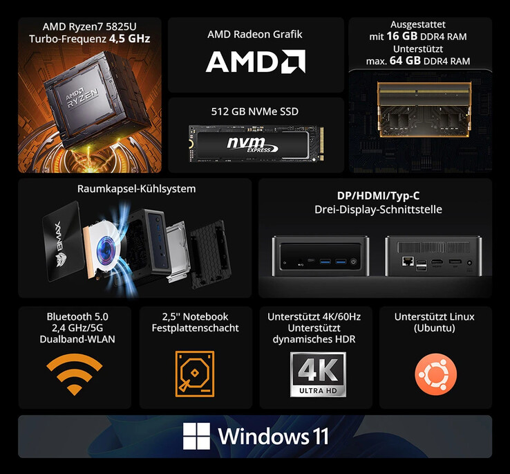 Für unter 300 Euro bietet der Bmax B5 A Pro eine beachtliche Ausstattung und Performance. Herzstück des Mini-PCs ist die AMD Ryzen 7 5825U CPU mit 8 Kernen, 16 Threads, 16 MB Smart Cache und einem Spitzentakt von 4,5 GHz. Dazu kommen in der angebotenen Konfiguration 16 GB DDR4 RAM (erweiterbar auf bis zu 64 GB) sowie eine 512 GB NVMe SSD.