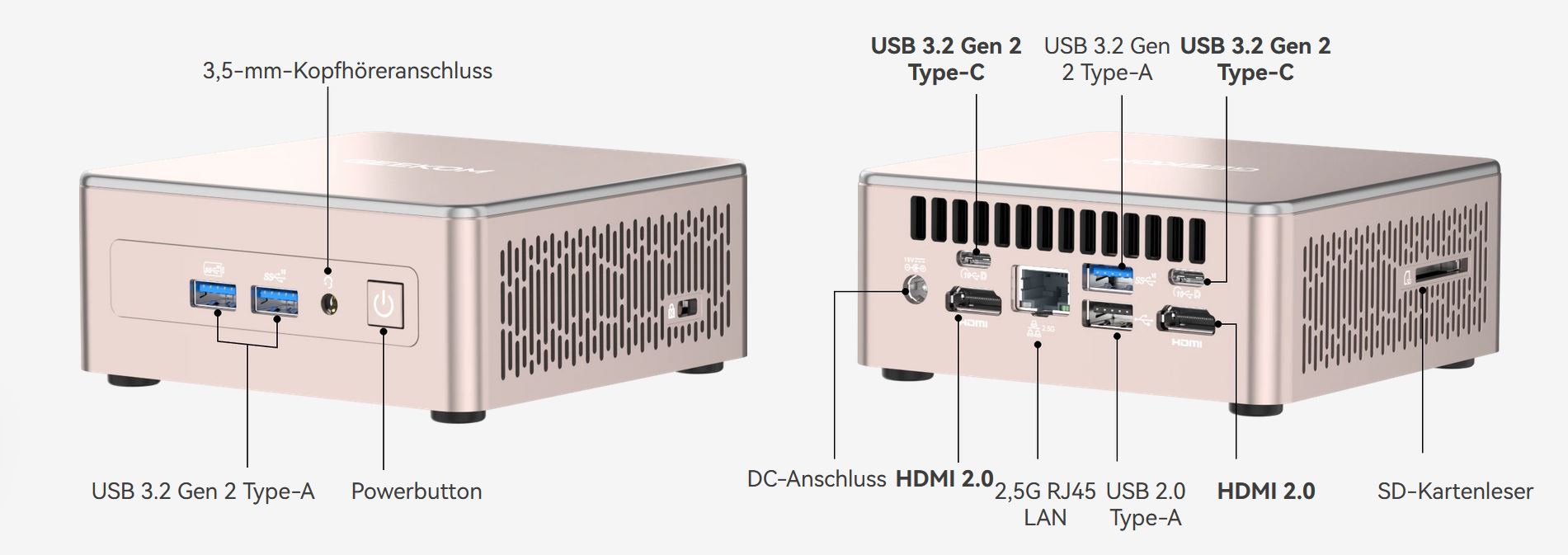 Für umfangreiche Konnektivität sorgen neben schnellem Wi-Fi 6 und Bluetooth 5.2 unter anderem je zweimal HDMI 2.0b und USB 3.2 Gen 2 Type-C. Ebenfalls zur Verfügung stehen weitere USB-Ports, 2,5-Gigabit-LAN, ein 3,5-mm-Kopfhöreranschluss sowie ein SD-Kartenleser. Verpackt ist dies alles in einem schicken Gehäuse, das mit 11,7 x 11,2 x 4,9 cm nicht nur ultrakompakt, sondern dank Vollmetallrahmen auch äußerst stabil ist. Als Betriebssystem ist Windows 11 Pro vorinstalliert.