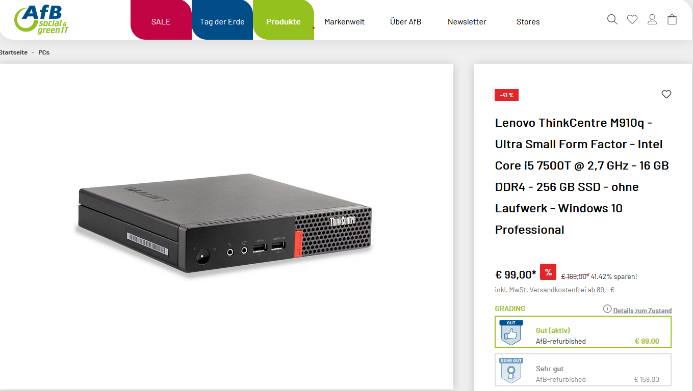 Der generalüberholte 1-Liter-Desktop-PC kann laut AfB-Shop leichte Kratzer oder / und Dellen auf dem Gehäuse aufweisen. Der M910q beherbergt einen Intel Core i5-7500T samt sparsamer 35-Watt-TDP, der auch im Jahr 2024 noch ausreicht, um im Internet zu browsen oder einfache Office-Software zu nutzen. Ein CPU-Upgrade ist dank LGA-1151-Sockel zwar möglich und der offiziell maximal unterstützte Core i5-7700T ist dank Hypethreading und höherem Takt bis zu 25 Prozent schneller, aber preislich unrentabel.