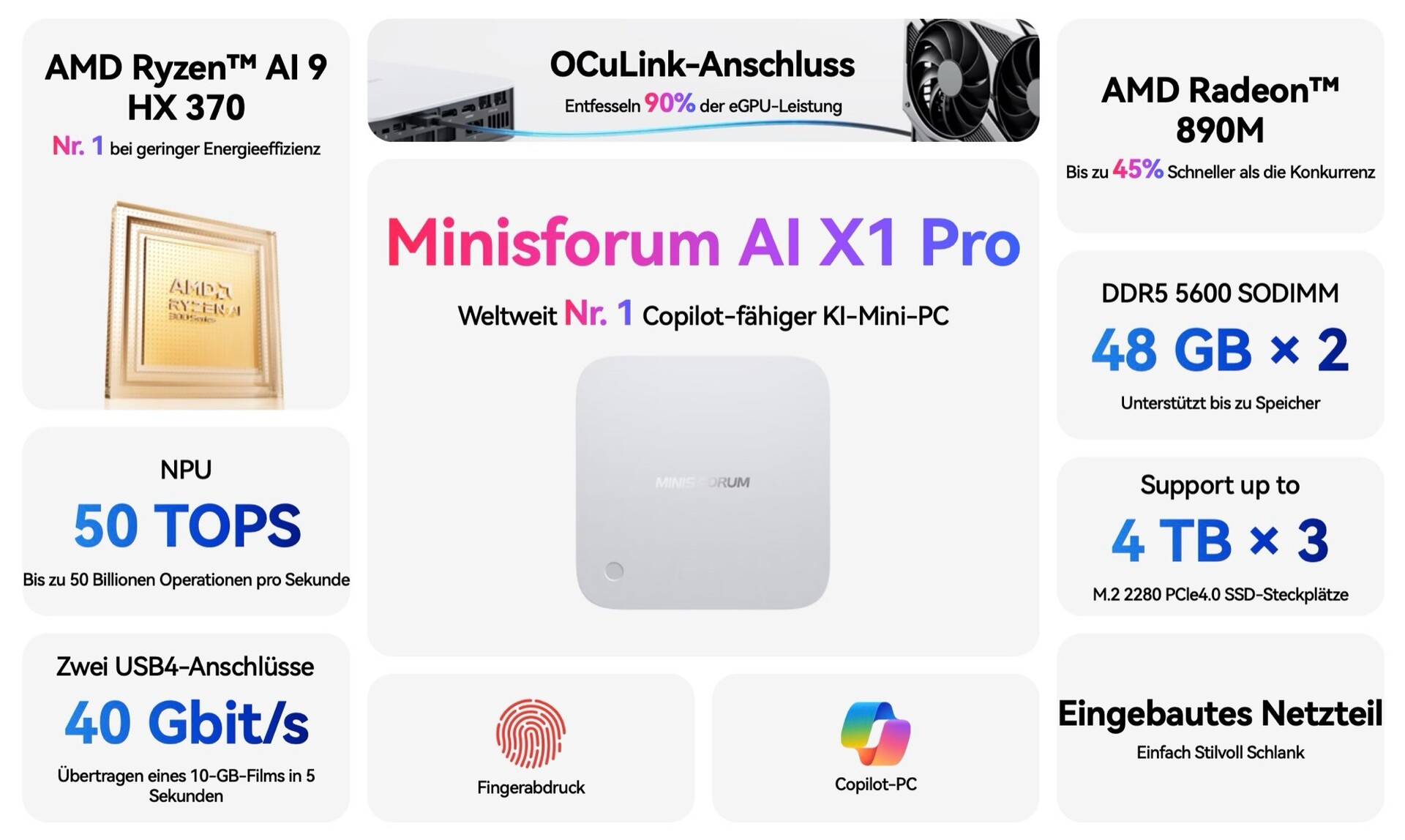 Der Minisforum AI X1 Pro unterstützt sowohl USB 4 (40 Gbit/s) als auch OCuLink, sodass das Gerät mit den meisten externen Grafikkarten am Markt kompatible ist. Allerdings soll Gaming auch ohne eGPU möglich sein, denn durch den AMD Ryzen AI 9 HX 370 mit zwölf Prozessorkernen und integrierter AMD Radeon 890M soll die Gaming-Performance im Vergleich zu Konkurrenten mit Radeon 780M bis zu 45 Prozent besser ausfallen. Wie groß der Vorsprung wirklich ausfällt, hängt stark vom jeweiligen Spiel ab.