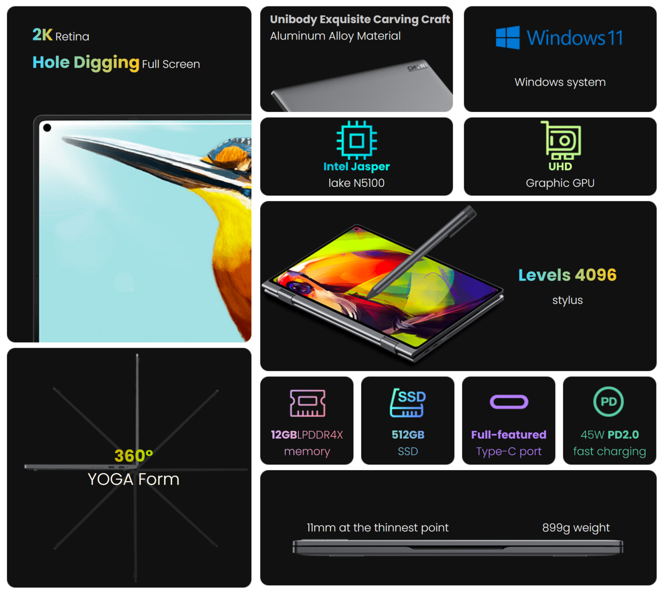 Die Besonderheit des Chuwi MiniBook X ist die Frontkamera, die für ein Notebook ungewöhnlich in einem Punch Hole oben links in der Ecke des Touchscreens sitzt. Ansonsten ist die Ausstattung dem Preis entsprechend solide. Das Herzstück ist der Intel Celeron N5100 mit bis zu 2,8 GHz Taktrate, den der Hersteller mit 12 GB DDR4-RAM und einer 512 GB großen SSD paart. Für die Grafikausgabe auf dem 10,8 Zoll großen 2K-Bildschirm, der um 360 Grad gedreht werden kann, ist die UHD Graphics GPU zuständig. Als Betriebssystem ist Windows 11 auf dem unter 1 kg leichten und 11 mm dünnen Gerät mit Aluminiumgehäuse vorinstalliert.