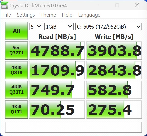 Alles in allem ein Super-Gerät ohne Schwächen, könnte man bis dato denken. Doch eines ist nicht wirklich durchdacht und ganz und gar nicht nutzerfreundlich: Gemeint ist die seitliche RGB-Beleuchtung, die sich so gut wie gar nicht individualisieren lässt. Wenn der Hersteller hier nicht nachbessert, werden die meisten Nutzer die Beleuchtung wohl eher komplett abschalten, was nicht im Sinne des Erfinders ist. Das Thema Speicherplatz ist ebenfalls ein Knackpunkt, denn 1 TB ist mit dem Wissen, dass es sich um einen Gaming-PC handelt, viel zu wenig. Zudem verpasst der Hersteller die Möglichkeit, die Leistung der Schnittstelle optimal zu nutzen, denn PCIe-5.0-SSDs werden unterstützt. Mit dem Slogan, dass der Minisforum AtomMan G7 PT der erste Mini-PC ist, welcher diese Anbindung bietet, erwartet man, dass diese auch genutzt wird. Ein Totalausfall ist die SSD in unserem Testsample nicht. Die Übertagungsraten sind gut, und auch die Kühlung hat Minisforum hier perfekt gewählt.