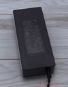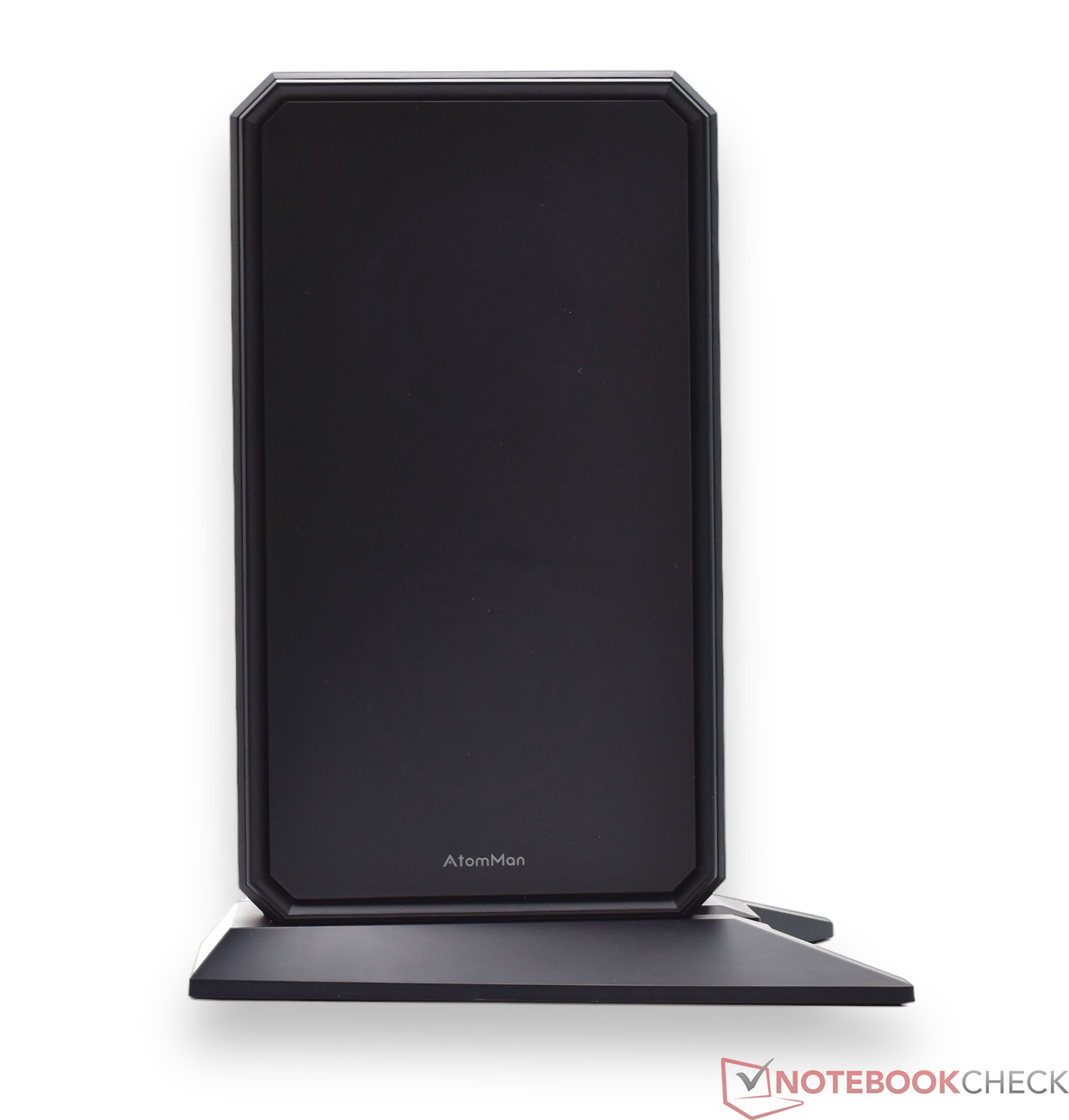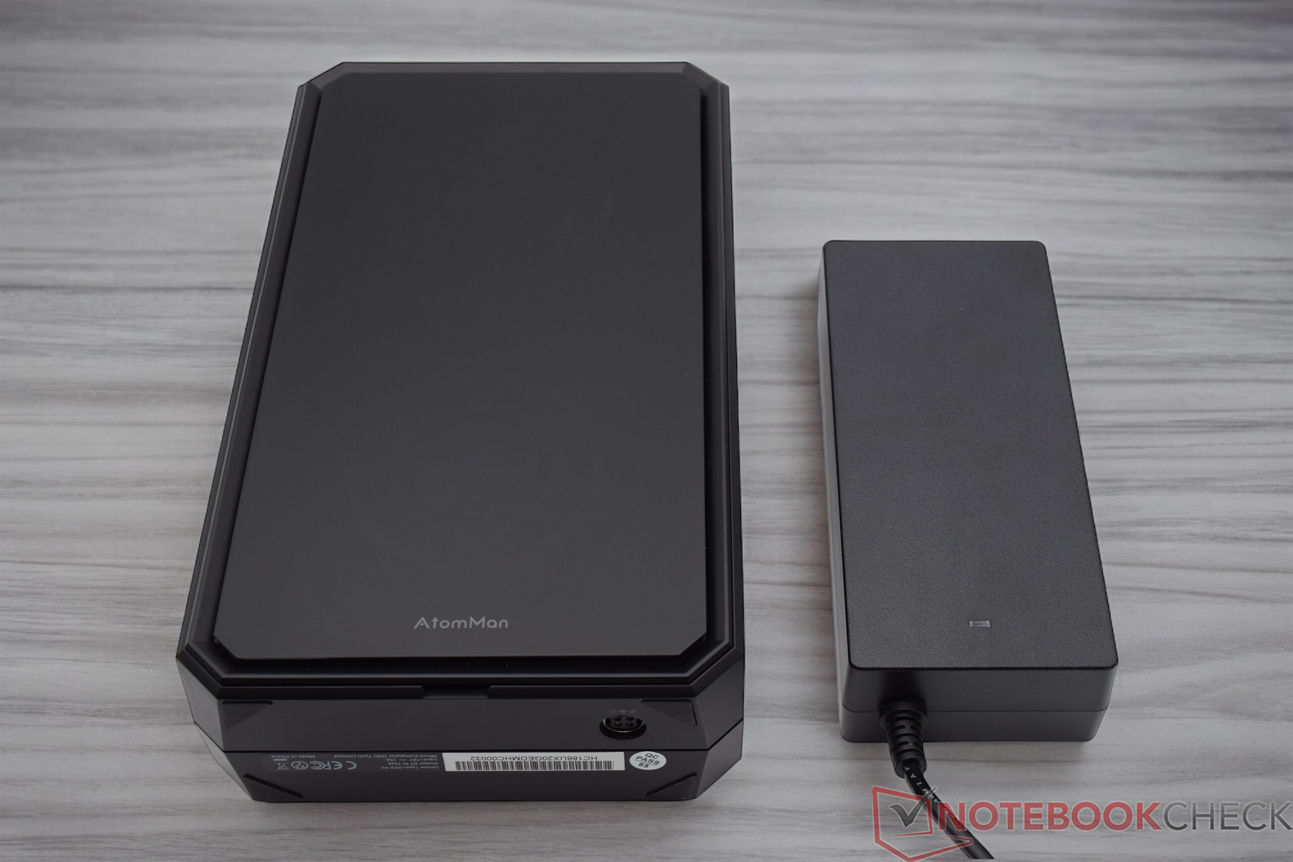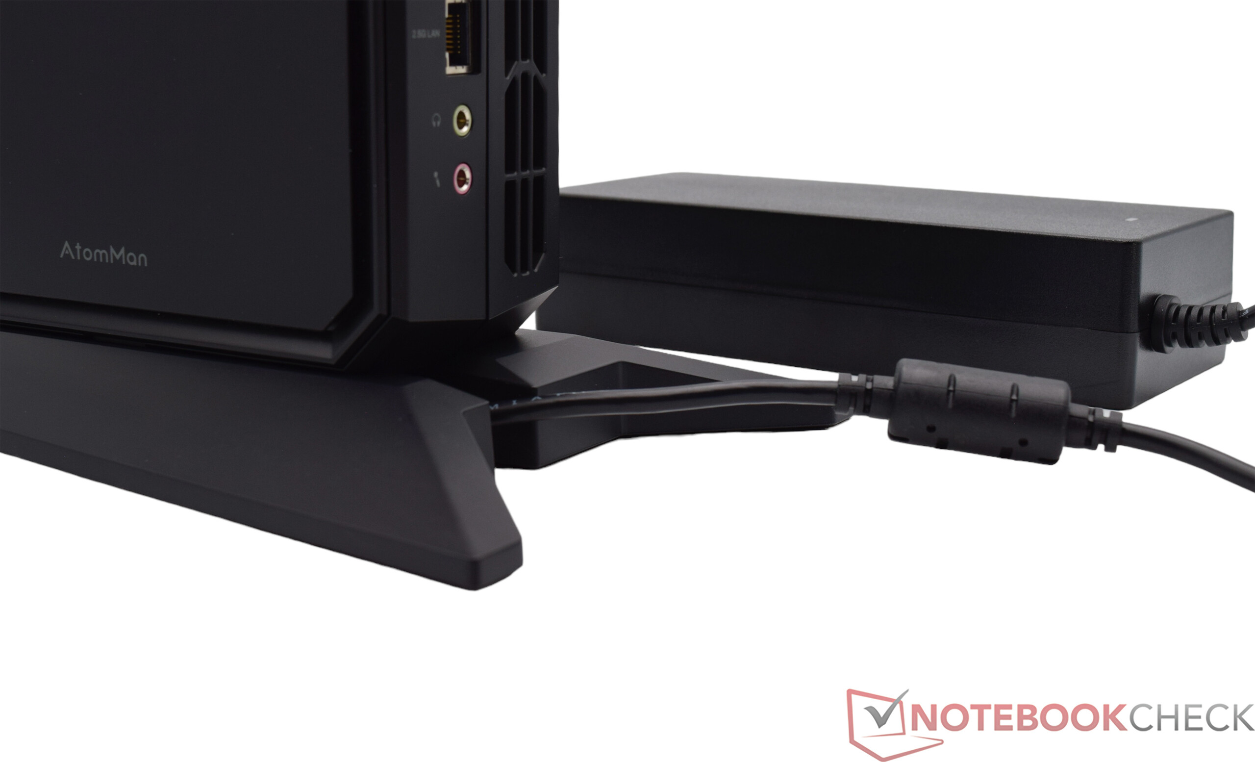 Bei den Abmessungen ist der Minisforum AtomMan G7 PT relativ genügsam, auch wenn wir dabei den Standfuß mit zugrunde legen müssen. Ohne diesen wäre das Gerät nochmals kompakter (Breite: 269 mm ; Höhe: 64 mm ; Tiefe: 155 mm). Beim Gewicht notieren wir knapp 2,8 kg, wenngleich der Standfuß allein etwas mehr als 400 Gramm auf die Waage bringt. Das 300-Watt-Netzteil ist aufgrund der Leistung mit 874 Gramm nicht zu vernachlässigen. Verglichen mit den ebenfalls sehr leistungsstarken Netzteilen von Acemagic (1,1 kg) oder Intel (1,3 kg) ist das Netzteil des Minisforum AtomMan G7 PT vergleichsweise leicht.