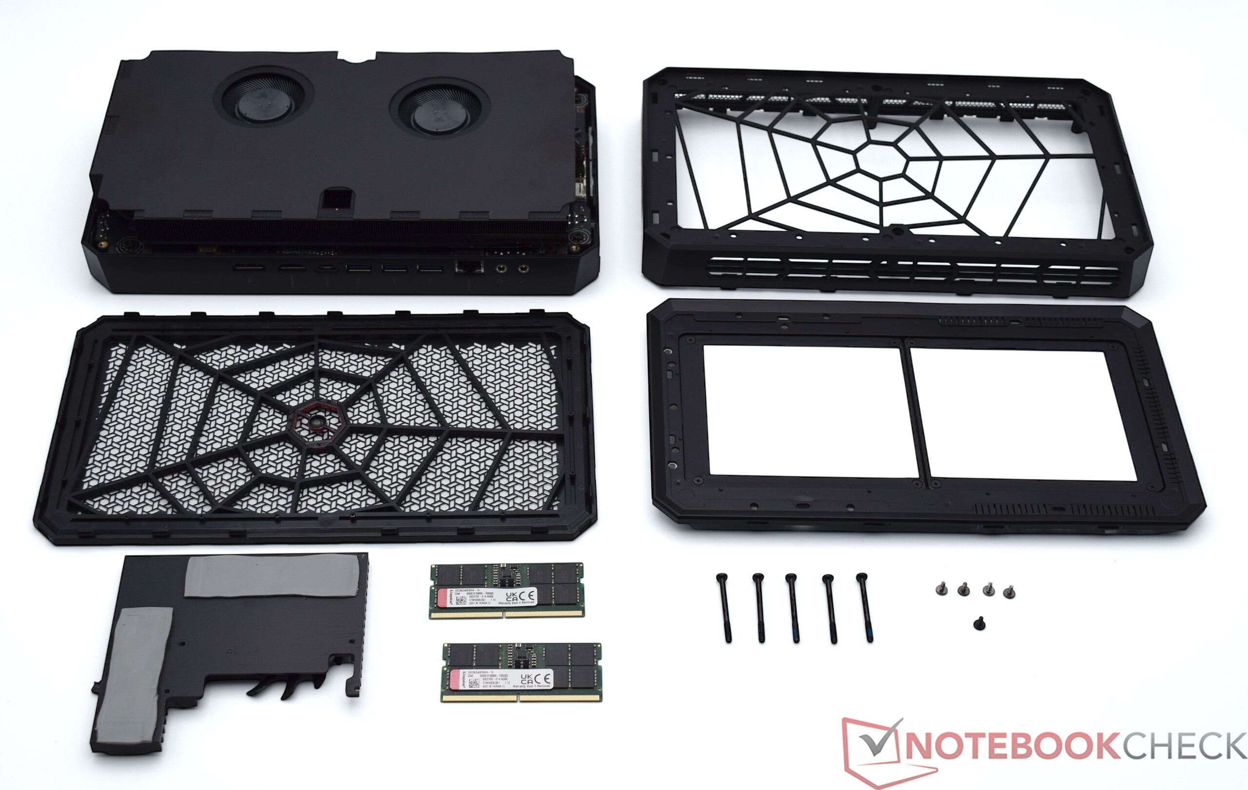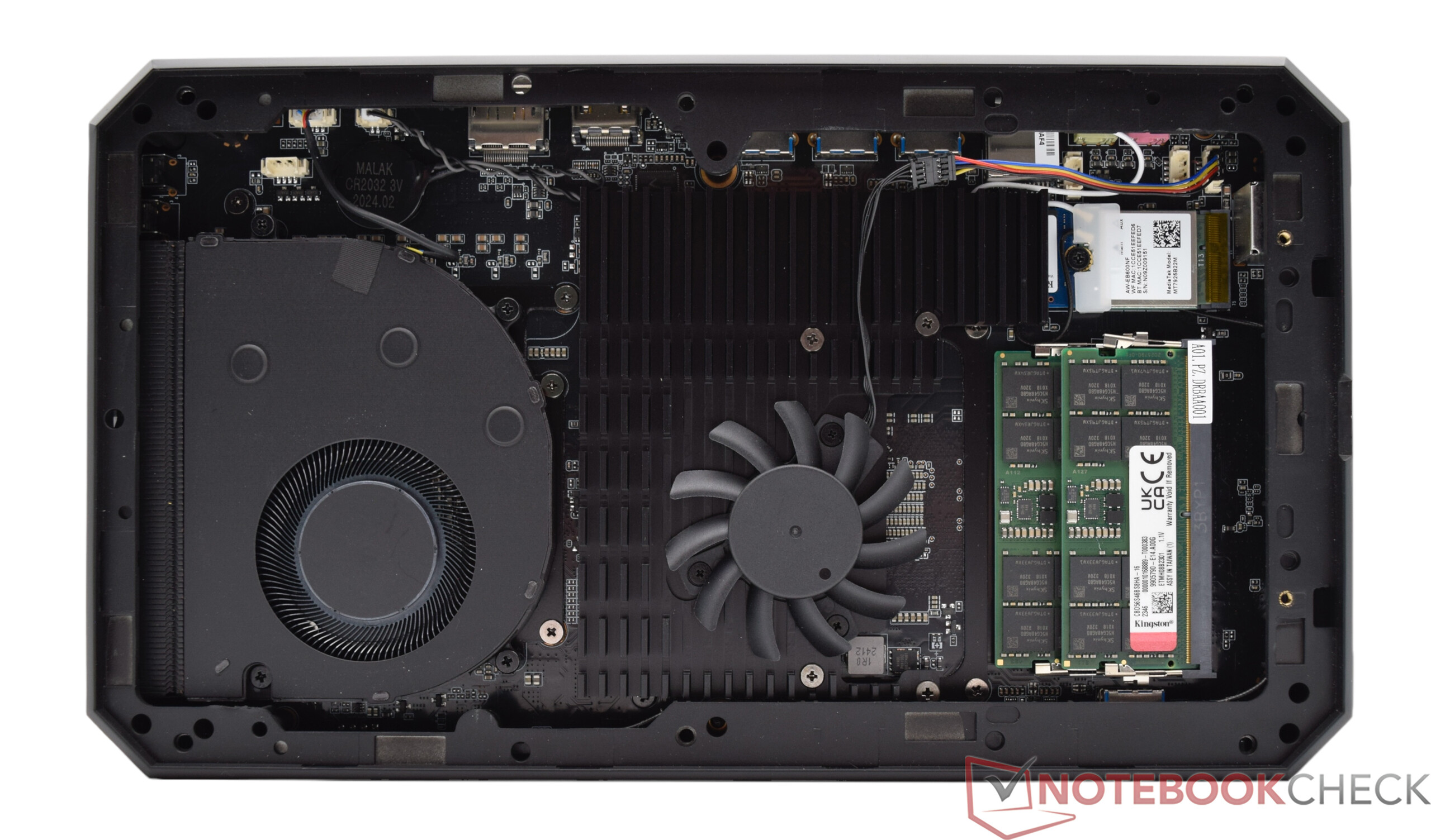 Der Minisforum AtomMan G7 PT wird aller Voraussicht nach nicht als Barebone-Variante erscheinen. Somit sind RAM und SSD immer bereits vorinstalliert, und nach kurzer Einrichtung ist das System dann startklar. Aufgrund der Tatsache, dass intern zwei M.2-Schnittstellen vorhanden sind, kann der Massenspeicher hier noch erweitert werden. Das Erreichen der Steckplätze für RAM und SSD gestaltet sich auf den ersten Blich recht schwierig. In der Praxis müssen jedoch nur zwei Schrauben entfernt werden, die auf der Seite mit den beiden LED-Modulen verbaut sind. Unter der magnetisch fixierten Seitenabdeckung, welche die Symbole beinhaltet, befinden sich die beiden Schrauben am unteren Rand. Nach dem Lösen lässt sich mit etwas Vorsicht die gesamte Einheit, samt LED-Elemente, entfernen. Aber Achtung: Auf der Rückseite sind Kabel, die vorsichtig abzogen werden können. Darunter befinden sich Massenspeicher und Arbeitsspeicher sowie das WLAN-Modul, was man ebenfalls ausbauen kann. Um an die Massenspeicher zu gelangen, muss die massive Kühleinheit demontiert werden. Das gestaltet sich ebenfalls recht einfach. Um an die anderen Lüfter zu gelangen, muss man die andere Seite demontieren. Dies ist allerdings etwas schwieriger und bedarf ein wenig Geduld sowie filigranes Werkzeug, um das Gehäuse nicht zu beschädigen. An die Lüfter selbst kommt man nicht unbedingt besser heran, womit sich die Demontage hier nicht so sehr lohnt. Auch haben wir an dieser Stelle einen Blick unter den Kühlkörper erhaschen können und gesehen, dass es sich bei der AMD Radeon RX 7600M XT nicht um ein MXM-Modul handelt.