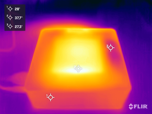 (+) Auf der Unterseite messen wir eine maximalen Wert von 38 °C (im Vergleich zum Durchschnitt von 36.4 °C).