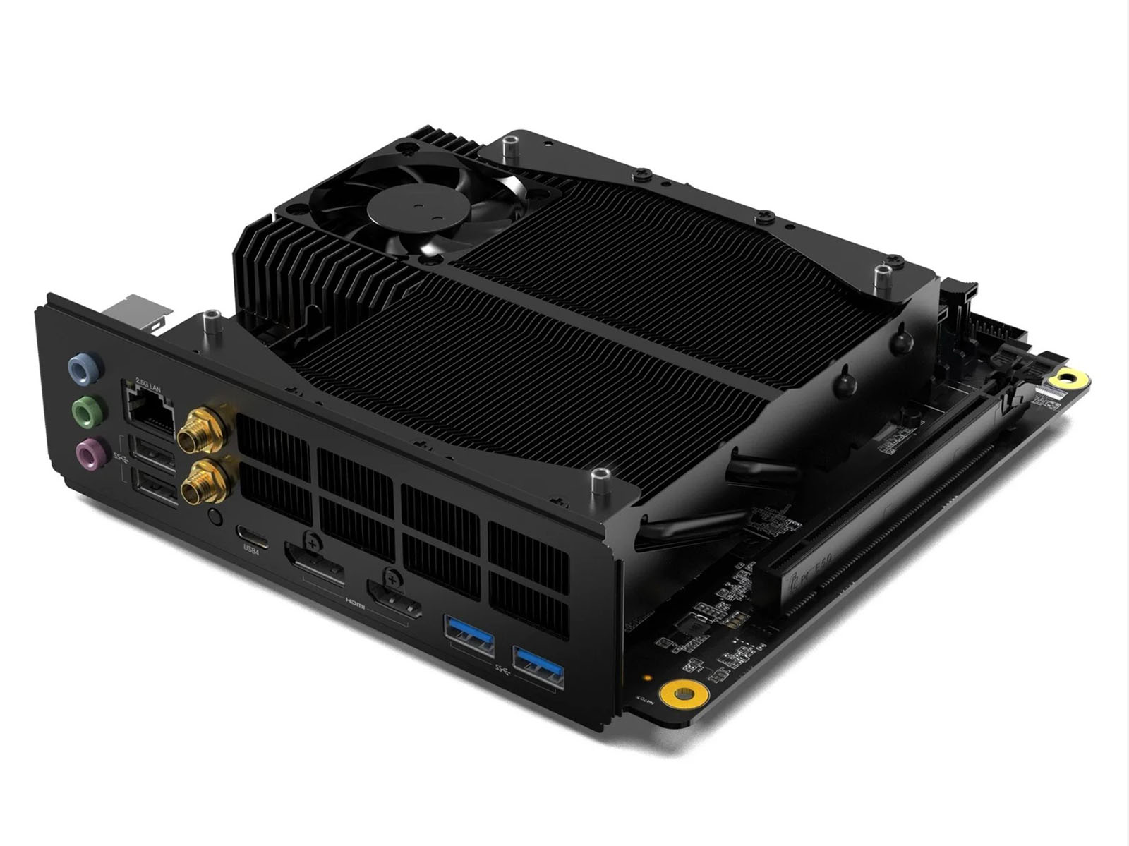 Als bekannter Mini-PC-Hersteller geht Minisforum beim BD770i einen etwas anderen Weg und bietet hier kompaktes Mini-ITX-Mainbord mit festverbauter CPU an. Das Herzstück des Minisforum BD770i ist der AMD Ryzen 7 7745HX, welcher zudem gleich mit einem großen Kühler bedeckt ist. Anders als bei kompletten Mini-PCs ist hier ein direkter Betrieb jedoch nicht möglich. Weitere Kosten für Gehäuse, Netzteil, RAM und SSD müssen einkalkuliert werden. Ein Lüfter für die Montage auf dem vorinstallierten Kühler muss ebenfalls beschafft werden. Diesen legt Minisforum dem BD770i leider nicht bei.