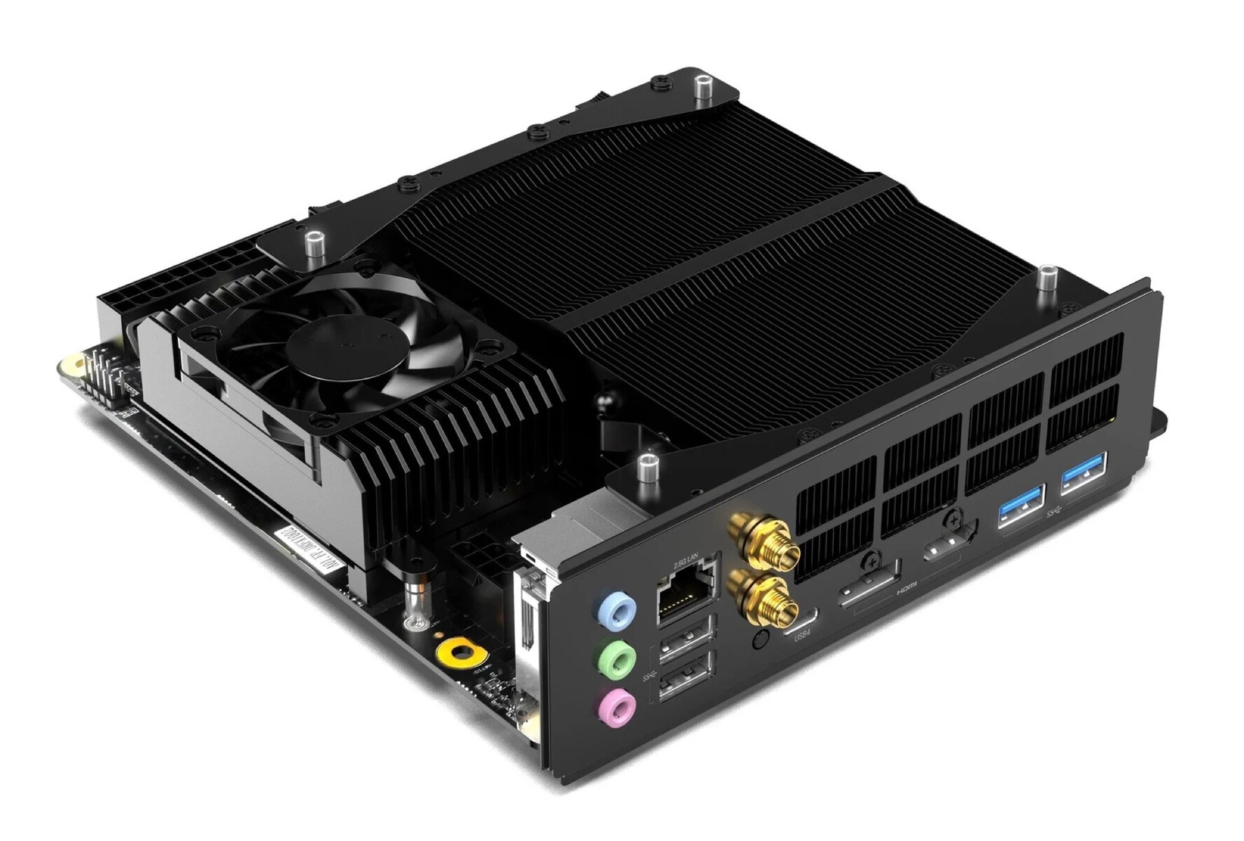 Das Mainboard unterstützt bis zu 64 GB DDR5-5.200-Arbeitsspeicher durch zwei SO-DIMMs sowie maximal zwei M.2-2280-SSDs, die per PCIe 4.0 angebunden werden. Über HDMI 2.0, DisplayPort 1.4 und USB-C können auch ohne dedizierte Grafikkarte mehrere Monitore angeschlossen werden. Das Mainboard besitzt darüber hinaus 2,5 Gbit/s Ethernet und vier USB-A-Ports. Der auf den Bildern gezeigte 120 Millimeter Lüfter muss separat gekauft werden.