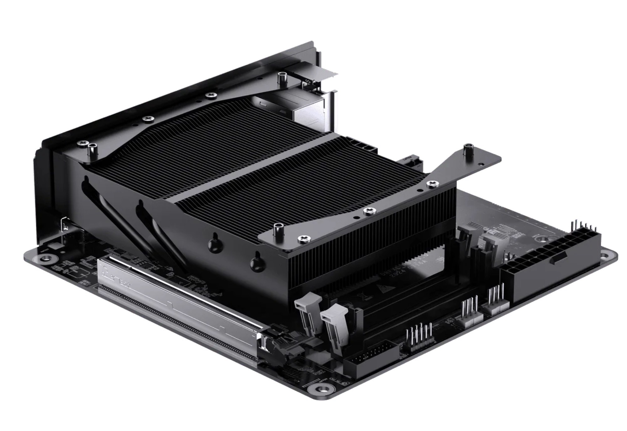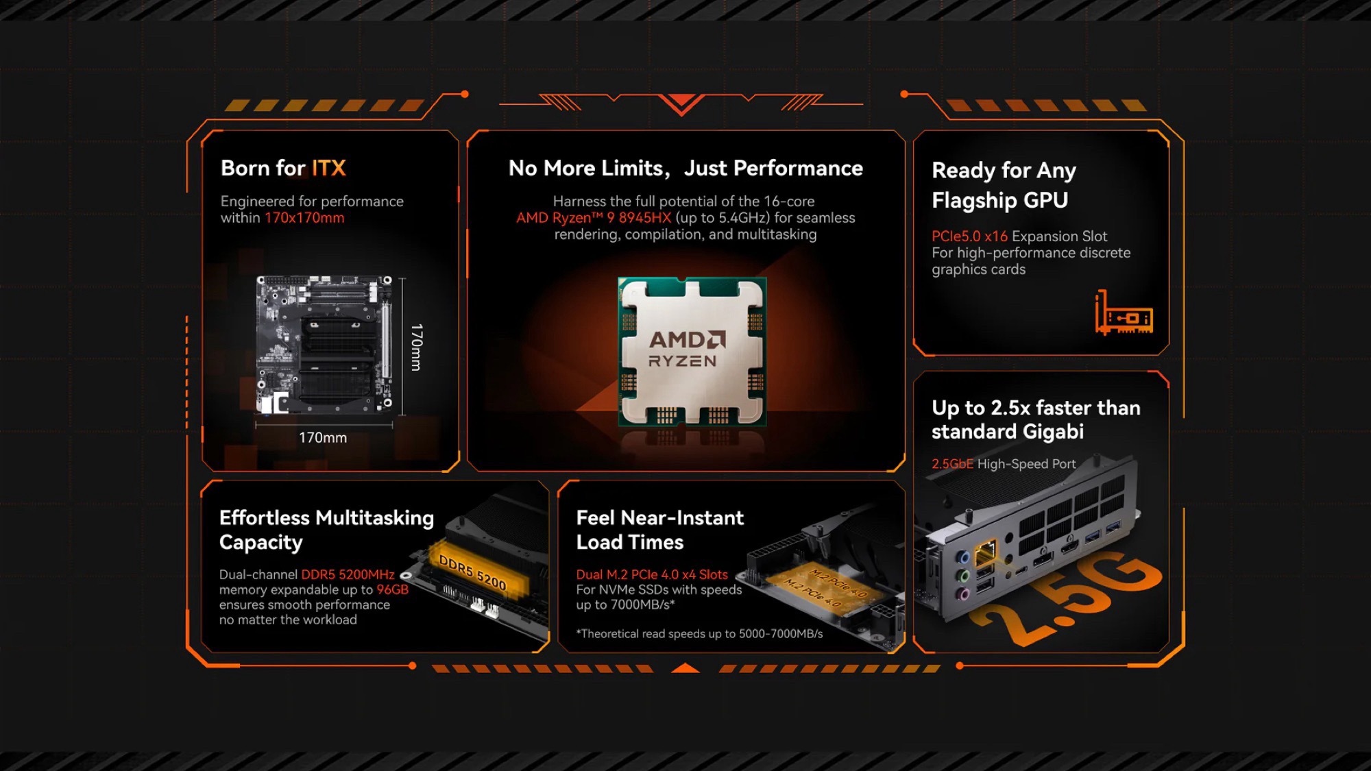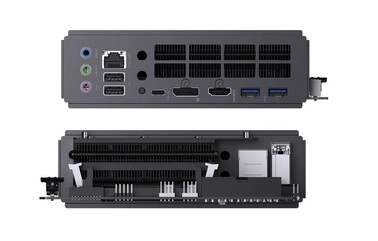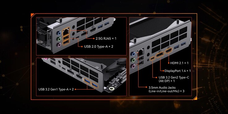 Das Mini-ITX-Mainboard misst 17 x 17 Zentimeter, und ist bereits mit einem Kühlkörper über dem Prozessor ausgestattet – eine Notwendigkeit, da kaum ein CPU-Kühler einen Laptop-Prozessor unterstützt. Trotz kompakter Maße soll das Mainboard kaum Kompromisse bei der Ausstattung machen. Über einen PCIe 5.0 x16 Slot in voller Größe lassen sich Grafikkarten bis hin zur GeForce RTX 5090 nutzen, durch zwei M.2-2280-Slots, die per PCIe 4.0 x4 angebunden werden, lassen sich zwei 4 TB SSDs (ca. 320 Euro auf Amazon) verbauen.