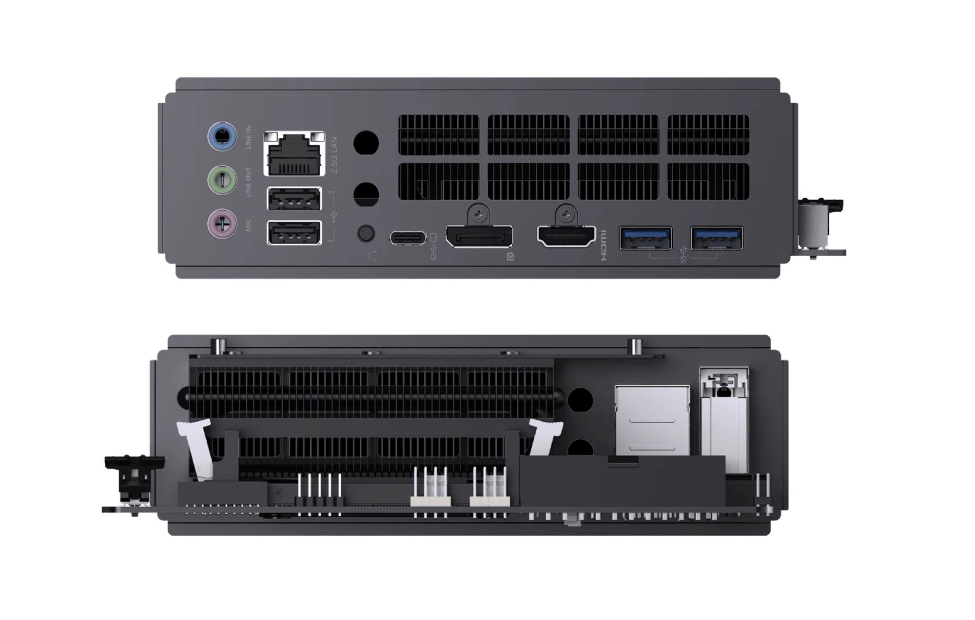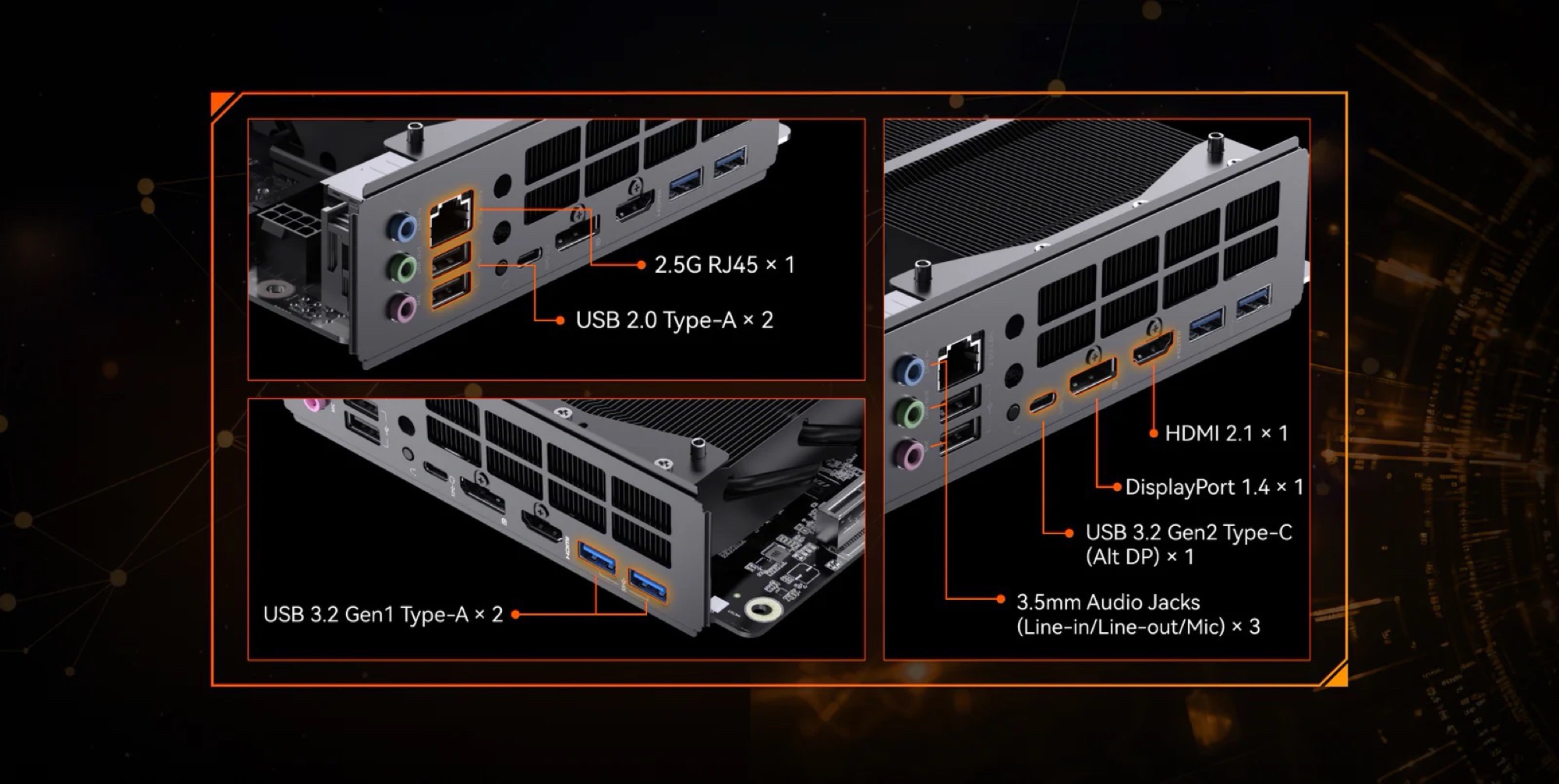 Das Mainboard unterstützt bis zu 96 GB DDR5-5.200-Arbeitsspeicher über zwei SO-DIMMs. Eine M.2-2230 Wi-Fi-Karte muss bei Bedarf separat erworben werden. Das Minisforum BD895i SE besitzt nur einen USB-C-Anschluss, der Datenraten bis 10 Gbit/s erreicht. Dafür gibts immerhin viermal USB-A, 2,5 Gbit/s Ethernet, HDMI 2.1 und DisplayPort 1.4. Standardmäßig werden drei Monitore unterstützt, durch eine Grafikkarte können aber weitere Bildschirme angeschlossen werden.