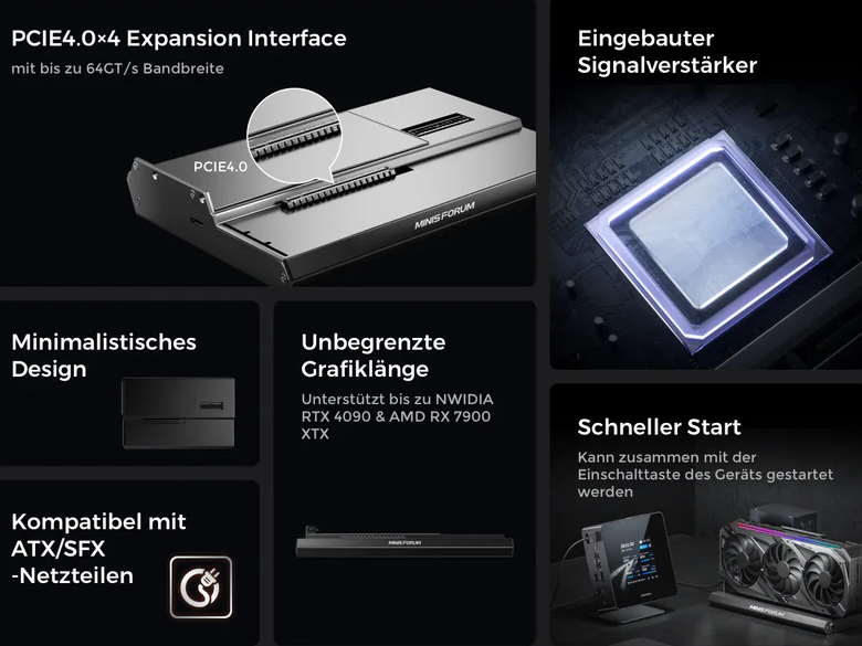Minisforum gibt die Abmessungen des DEG1 mit 185 x 50 Millimetern an, im Prinzip gibt es keine Einschränkungen, welche Grafikkarte installiert werden kann - diese Beschränkung stellt dann eher das genutzte Netzteil dar. Minisforum bewirbt die Möglichkeit, die Grafikkarte beim Start schnell zu starten - und zwar gleich dann, wenn der PC gestartet wird.