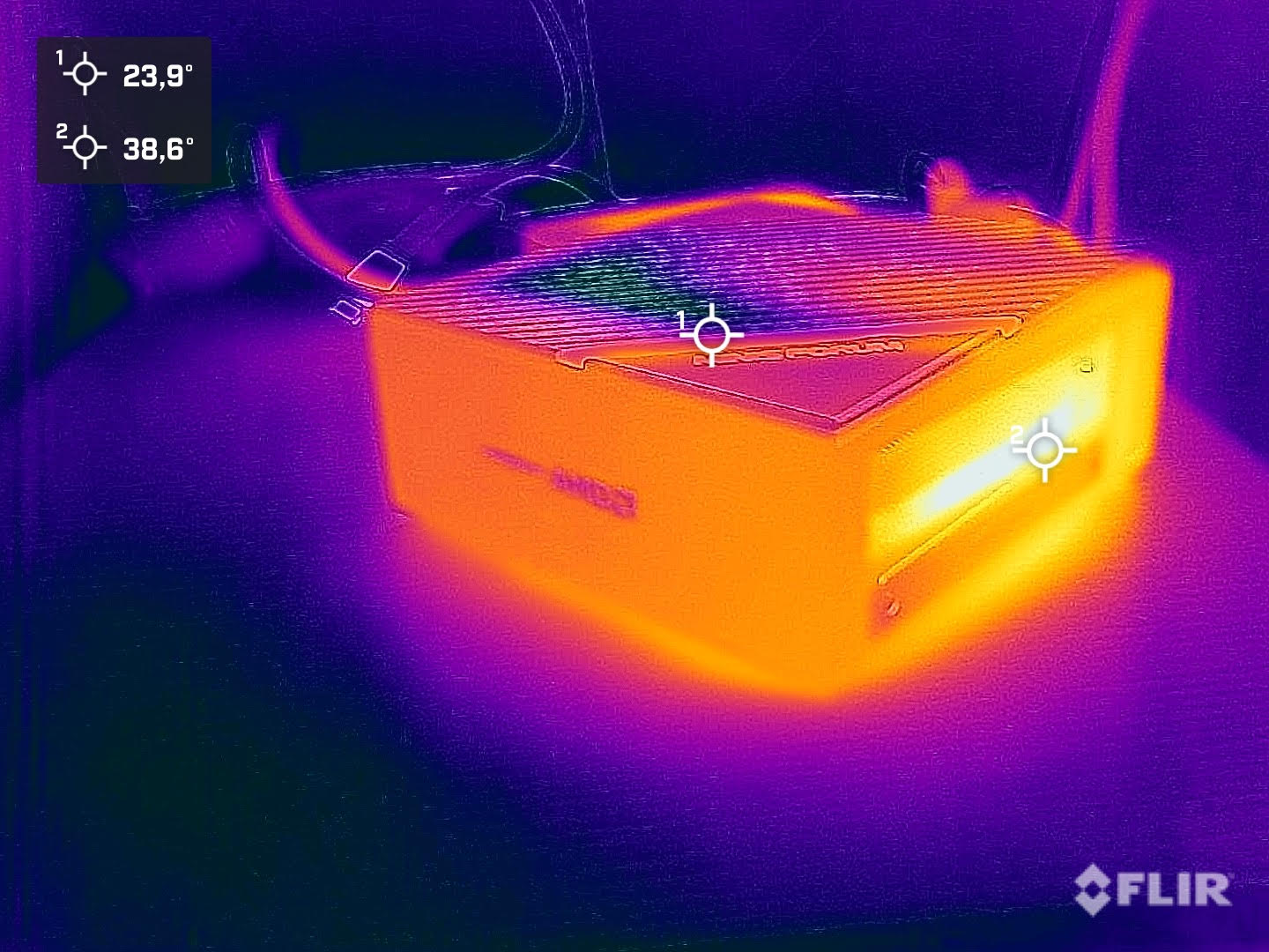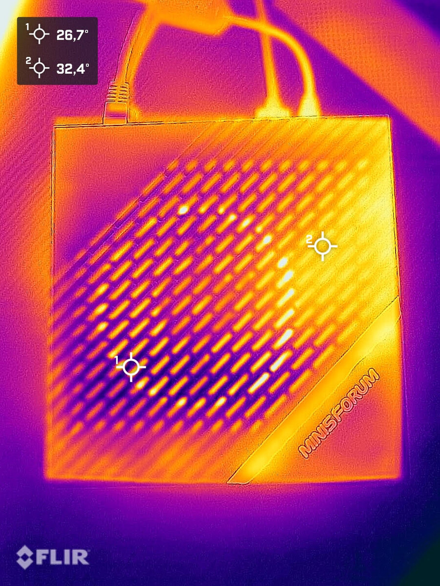 Wer sich den Miniforum EliteMini B550 als kleinen Office-PC oder auch als Gaming-PC anschaffen, ist in puncto Lautstärke auf der sicheren Seite. Das Kühlkonzept überzeugt und arbeitet auch unter Volllast relativ leise. Mit maximal 37 dB(A) ist ein leises Rauschen hörbar. Aufgrund der niedrigen Frequenz ist dies aber nicht störend. Im Testaufbau mit der externen Grafikkarte und dem Netzteil war von dem Mini-PC nichts mehr zu hören. Hier waren die anderen Komponenten deutlich lauter. Aufgrund der Tatsache, dass diese hier nur optional zum Test herangezogen wurden, haben wir hierbei auf die Lautstärkemessung verzichtet.