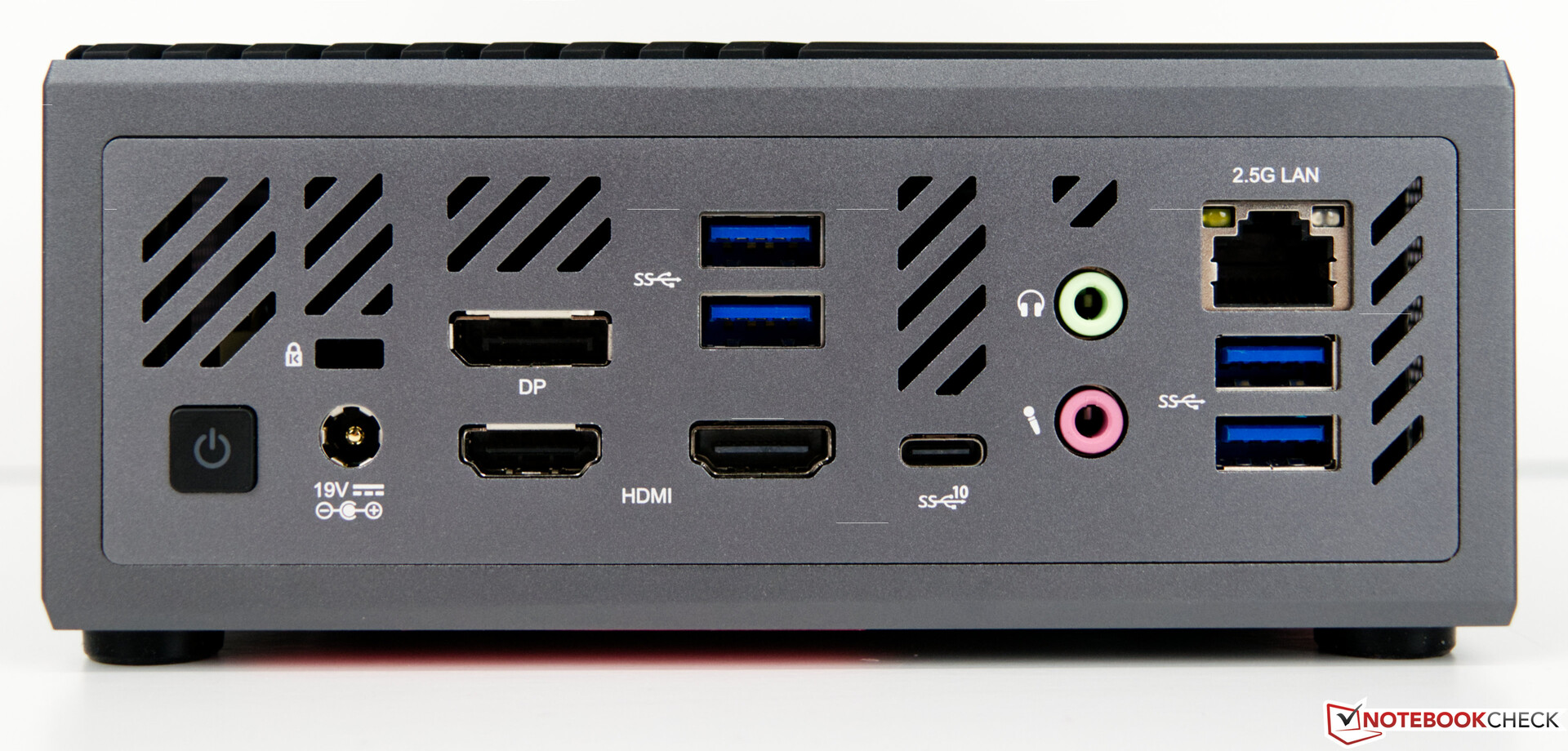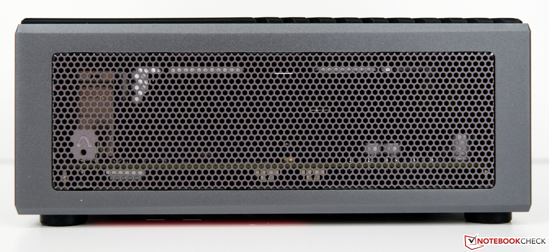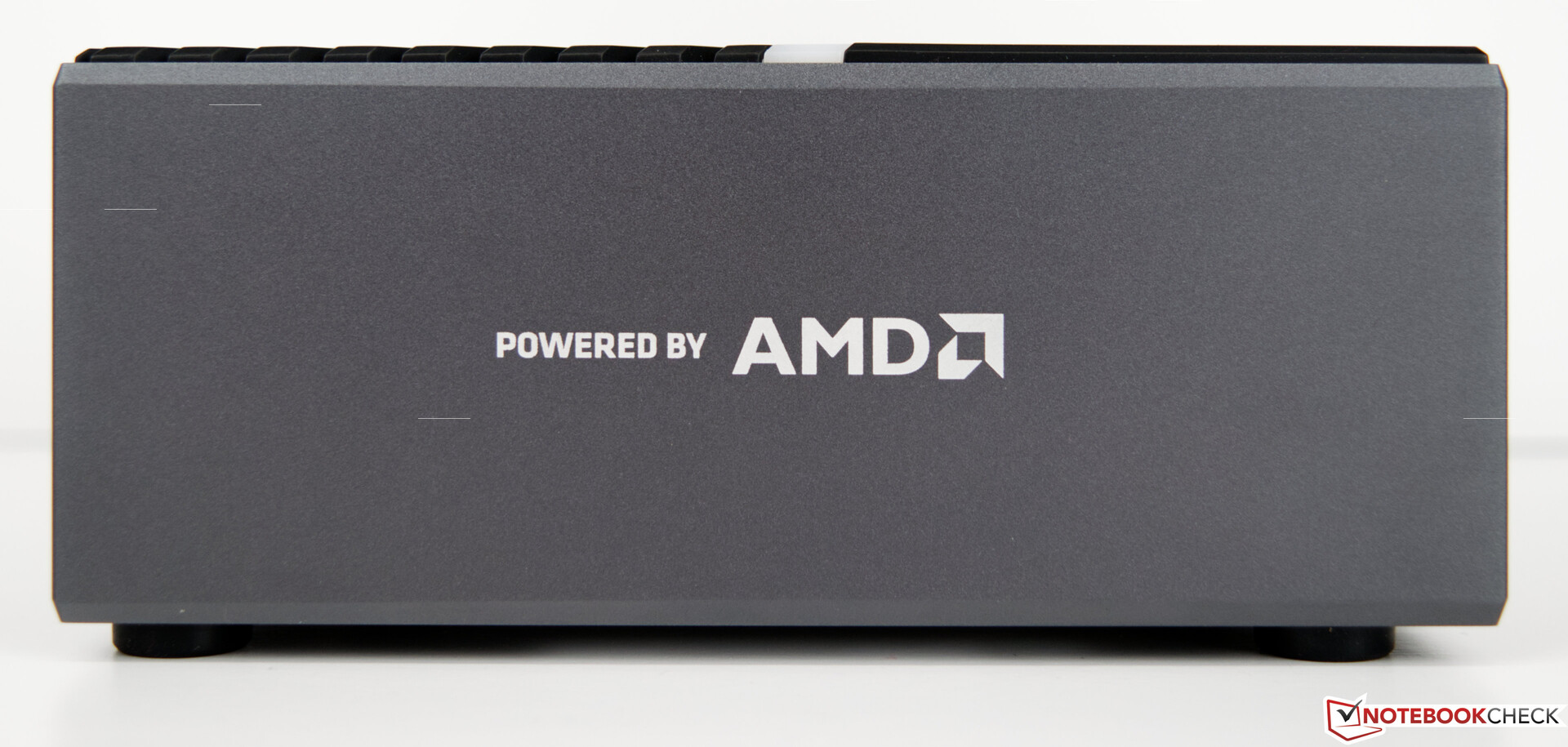 Optisch passt der Minisforum EliteMini B550 ganz klar in die Familie der EliteMini-PCs, auch wenn dieser farblich etwas von den anderen Modellen abweicht. Der Minisforum EliteMini B550 ist überwiegend in Grau uns Schwarz gehalten, was der Optik aber insgesamt guttut. Ein dezenter blauer LED-Streifen erscheint beim Einschalten und simuliert somit die Power-LED. Das Kühldesign erinnert an andere Mini-PCs aus dem Hause Minisforum. Warum soll auch das Rad neu erfunden werden. An der Oberseite wird die Frischluft angesaugt und über die Seiten aus dem Gehäuse gedrückt.