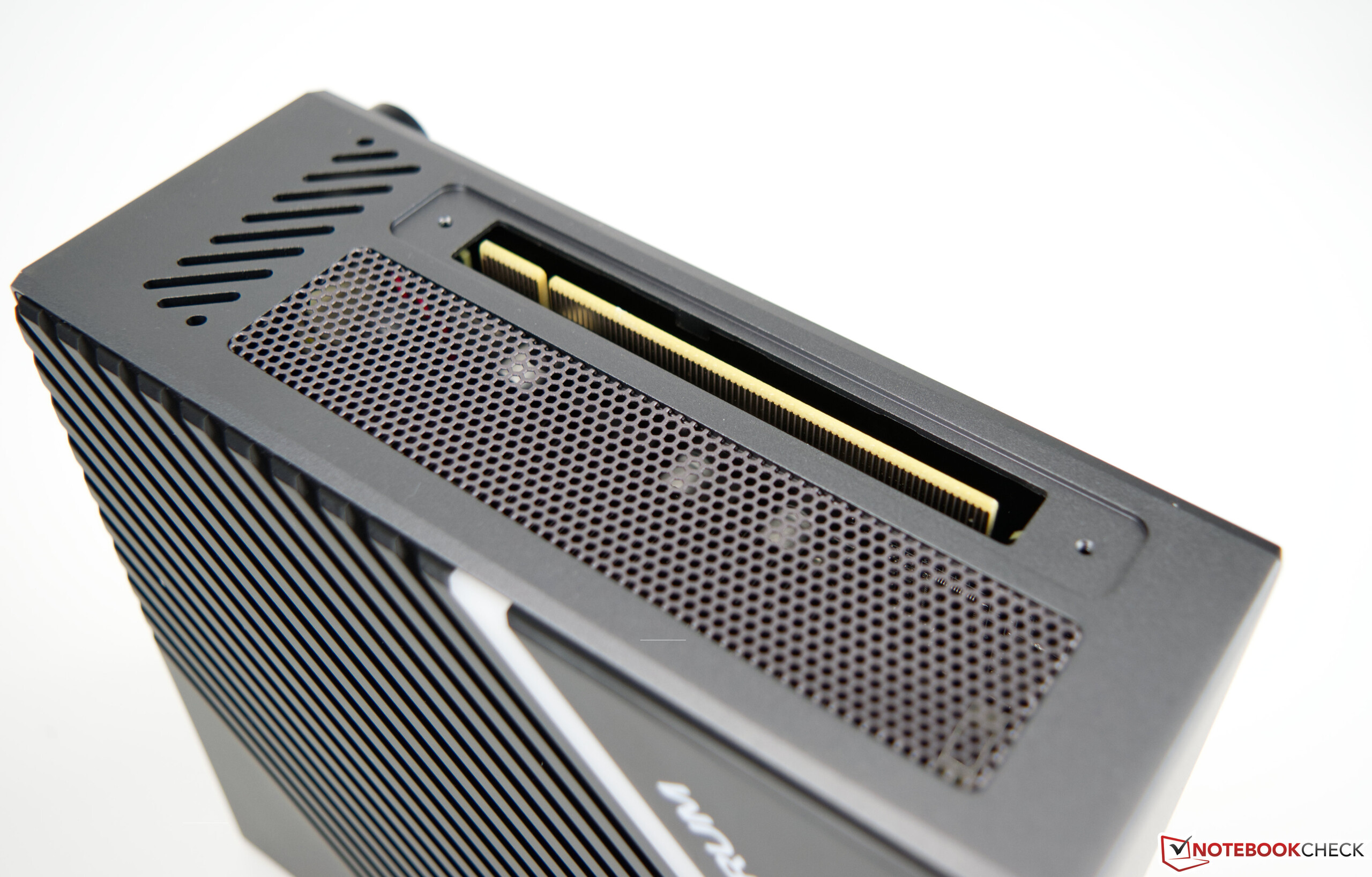 Bei den Materialien überwiegt Kunststoff, mit einigen Aluminium-Akzenten. Haptisch macht das Gerät einen sehr hochwertigen Eindruck. Auch das GPU-Mounting ist hochwertig verarbeitet, auch wenn dieses ebenfalls aus Kunststoff und Aluminium besteht. In Verbindung mit einer externen Grafikkarte muss der Minisforum EliteMini B550 hochkant in den PCI-Express-Slot gesteckt und anschließend verschraubt werden. Die Konstruktion ist sehr stabil und schnell erledigt. Mit nur etwas über einem Kilogramm ist der Minisforum EliteMini B550 sehr leicht und mit nur 15,8 x 16,6 Zentimetern fällt die Stellfläche auf dem Schreibtisch sehr klein aus. Das 120-Watt-Netzteil bringt knapp 600 Gramm auf die Waage.