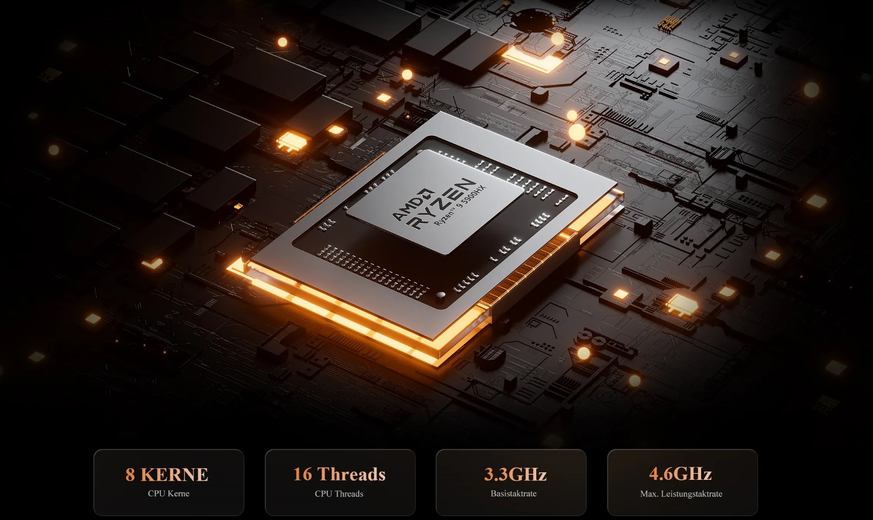 Der zum Einsatz kommende AMD Ryzen 9 5900HX gehört der Cezanne-Serie-Familie an und basiert auf der Zen3-Architektur. Das SoC bietet 8 physikalische Rechenkerne mit insgesamt 16 Threads (dank SMT). Davon profitieren vor allem Multi-Thread-Anwendungen. Die Leistung des AMD Ryzen 9 5900HX ist gut und insgesamt liefert der HX90G eine bessere Performance als der HX90 mit gleichem SoC. Um sich aber rein von der CPU-Leistung deutlicher abzusetzen, wäre es besser gewesen, AMDs aktuelleren SOC, den Ryzen 9 6900HX, einzusetzen. In unserem Performance-Rating trennen diese beiden genau 10 Prozent. Mit dem Minisforum NUCXi7 hat der HX90G einen weiteren Kontrahenten aus dem eigenen Hause. Den Intel Core i7-11800H hat der AMD Ryzen 9 5900HX sehr gut im Griff. Gegen den Intel Dragon Canyon NUC auf Basis der aktuellen Alder-Lake-Generation muss sich unser Testsample jedoch geschlagen geben. In Zahlen bedeutet dies 12 Prozent weniger Leistung in unserem Performance-Rating, was im Alltag aber nicht als spürbar bezeichnet werden kann.