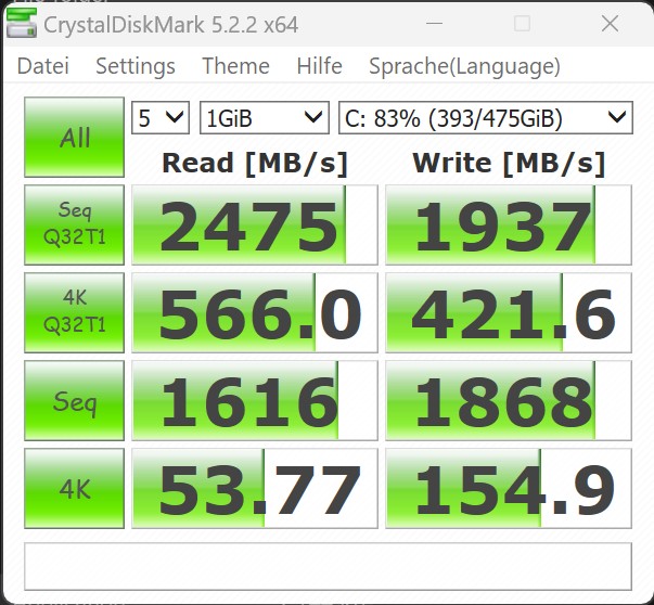 Als Massenspeicher gibt es in unserer Ausstattungsvariante eine NVMe SSD mit 512 GB Speicherplatz. Das verbaute Modell ist schnell und sortiert sich im Mittelfeld ein. Gegen die schnelleren PCIe-4.0-SSDs muss sich unser Testsample geschlagen geben. Für den Alltag ist die Leistung dennoch völlig ausreichend, was die Transferraten angeht. Beim eigentlichen Speicherplatz kann man jedoch anderer Meinung sein, da es sich beim Minisforum HX90G um einen Gaming-PC handelt. Mit 512 GB fällt der Speicherplatz sehr gering aus und neben dem vorinstallierten Betriebssystem bleiben dem Anwender etwa 450 GB an Speicherplatz übrig. Als Gaming-Gerät erwarten wir mindestens 1 TB an Speicherplatz. Mit dem zweiten M.2-Slot lässt sich der Speicher aber zum Glück zu einem späteren Zeitpunkt schnell erweitern.