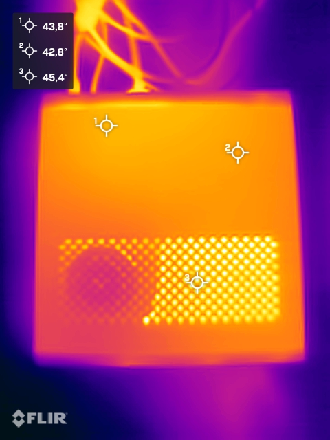 (±) Auf der Unterseite messen wir eine maximalen Wert von 42.8 °C (im Vergleich zum Durchschnitt von 36.4 °C).
