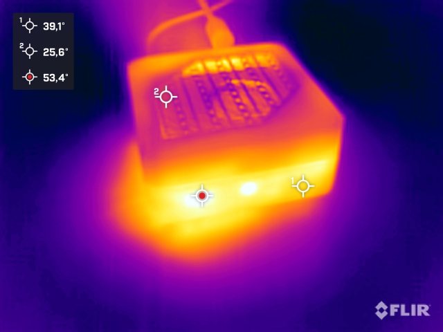 Das Gehäuse des Minisforum Mercury Series EM680 erwärmt sich sowohl im Leerlauf als auch unter Last nur geringfügig, da die warme Luft direkt aus dem Gehäuse geleitet wird. Der Hersteller verbaut insgesamt zwei kleine Lüfter, welche zum einen das SoC und zum anderen die SSD auf der Unterseite kühlen.