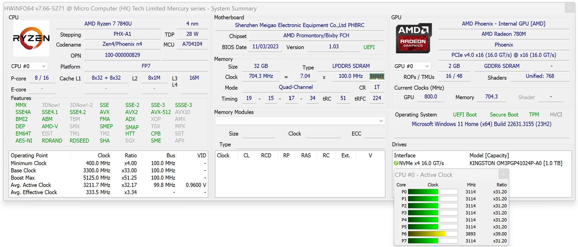 Im Minisforum Mercury Series EM780 kommt immer der AMD Ryzen 7 7840U zum Einsatz. Als Nachfolger des AMD Ryzen 7 6800U kann das neuere SoC etwas höher takten und bekommt mit der AMD Radeon 780M eine moderne iGPU verpasst. Aufgrund dieser Eckdaten sollte der Mini-PC auch mit aufwendigeren Aufgaben gut umgehen können. Zur Seite stehen dem SoC noch 32 GB LPDDR5-RAM (6.400 MT/s) sowie eine 1-TB-SSD.